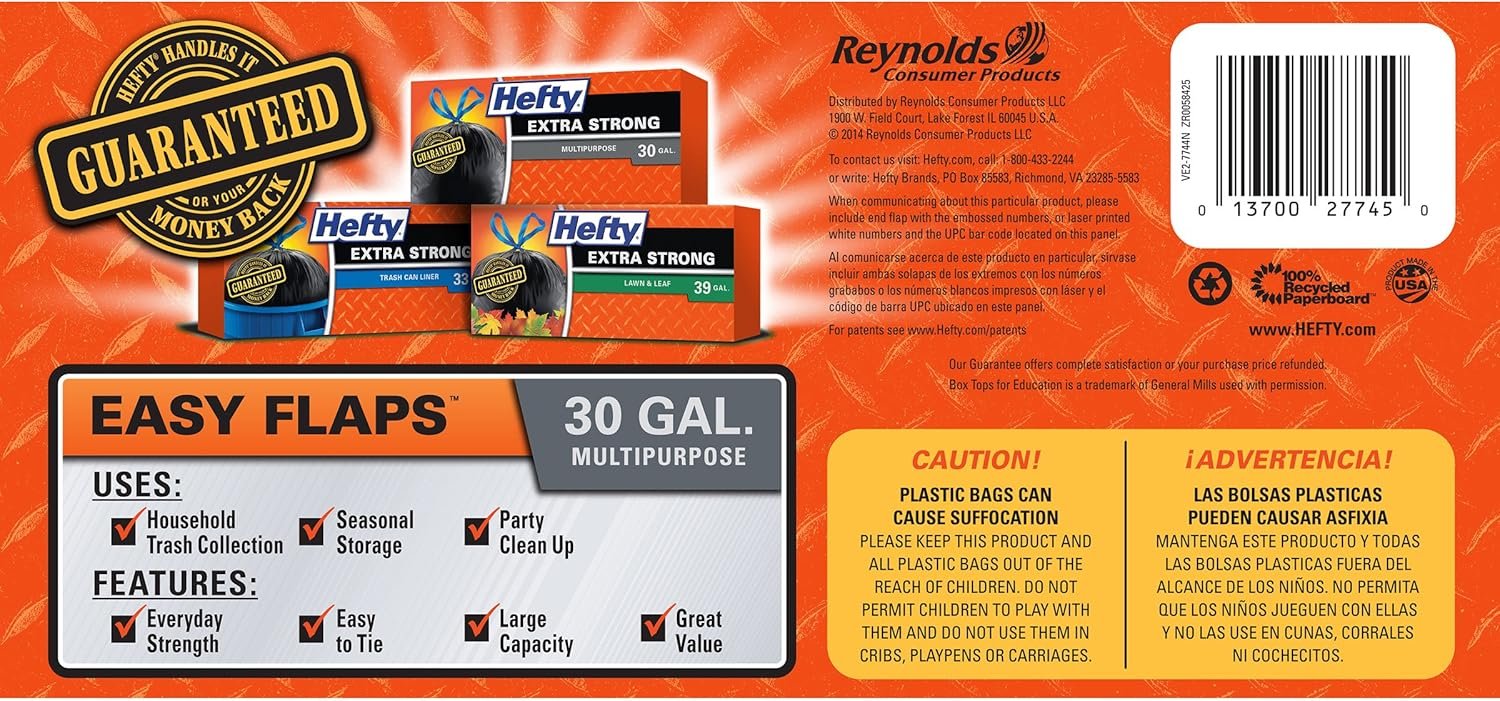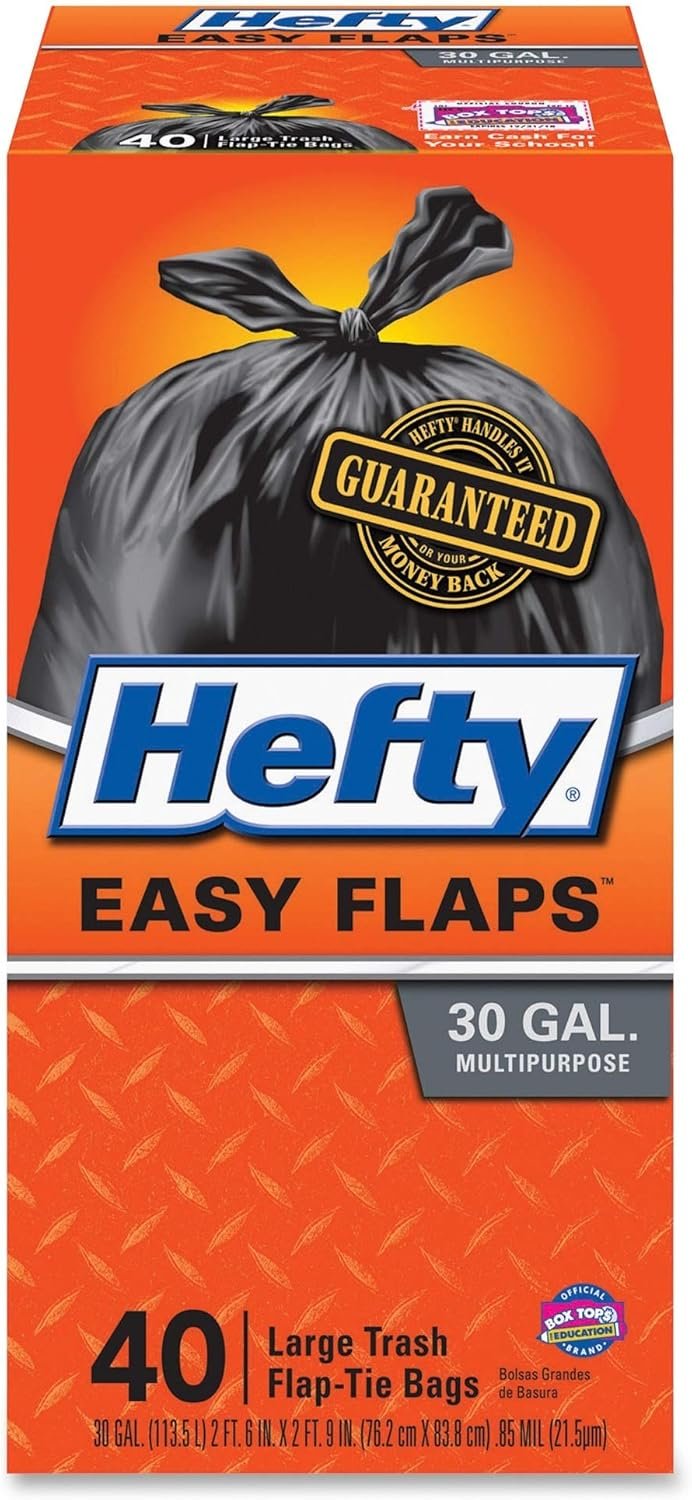 Hefty Easy Flaps Large Trash Bags are made with a thicker gauge plastic than other large black garbage bags. Tackle post-party pick-up, no matter how crazy last night got. Use the unscented trash bags to store clothes you’re not quite ready to part with or pack up those clothes for donations. These 30 gallon garbage bags are great for cleaning up your basement, garage and yard. The 30 gallon capacity lets you load up each garbage bag to tackle your large jobs. Plus, the unscented bags are ideal for sensitive noses. All Hefty Trash bags are backed by a 100% satisfaction guarantee, so you know Hefty is there to help you tackle the next mess.
