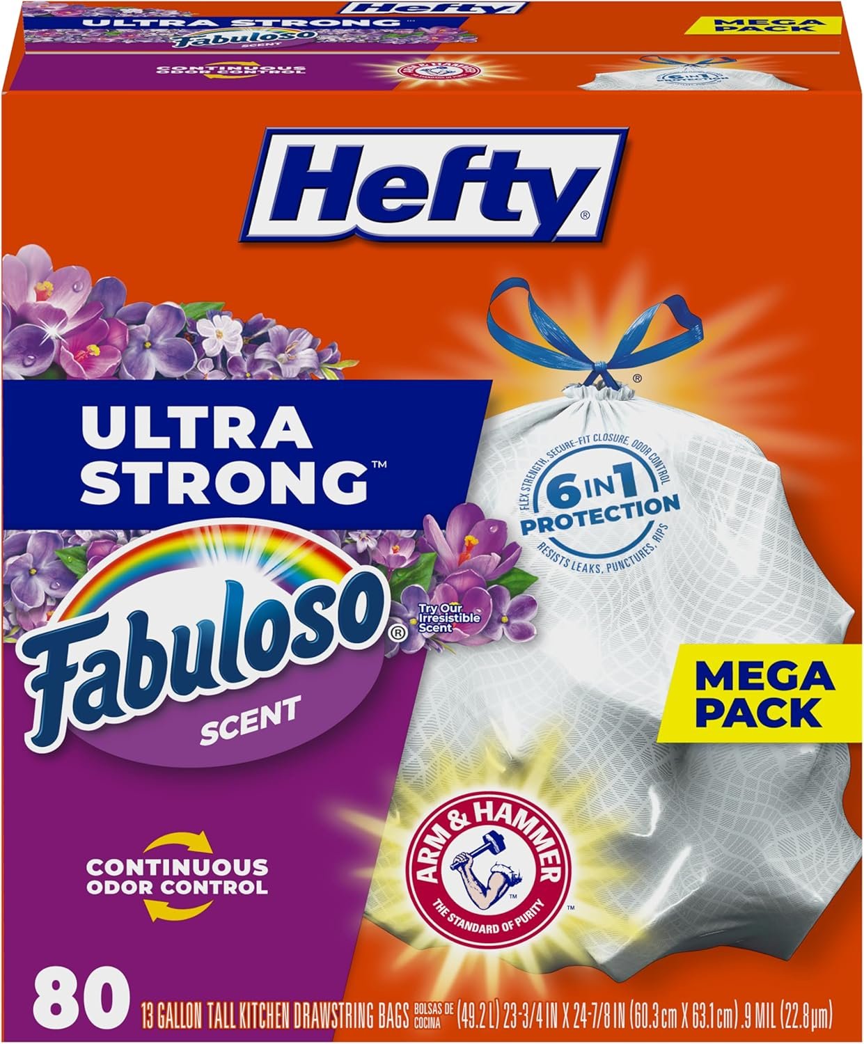 Trust Hefty Ultra Strong 13 Gallon Trash Bags to keep your kitchen waste contained—all the way from the can to the curb. Thanks to 6-in-1 Protection, these tall kitchen trash bags offer flexible strength, a secure closure, patented odor control, and resistance to leaks, punctures, and rips. The result is the highest protection you can get in flexible 13 gallon trash bags. Hefty’s stretchy strength means you don’t have to worry about unexpected bag breakage and inconvenient messes when you use these tall kitchen garbage bags. A break-resistant grip drawstring makes it easy to close the bag and cart it away without incident. As a bonus, these scented white trash bags include patented Arm and Hammer continuous odor control and a Fabuloso scent to keep unpleasant smells at bay and keep your kitchen smelling fresh and clean. All Hefty trash bags are backed by a 100% satisfaction guarantee. *Fabuloso (R) and associated designs are trademarks of Colgate-Palmolive Company and are used under license. **The ARM and HAMMER trademark is owned by Church and Dwight Co., Inc., and used by Reynolds Consumer Products LLC under license.