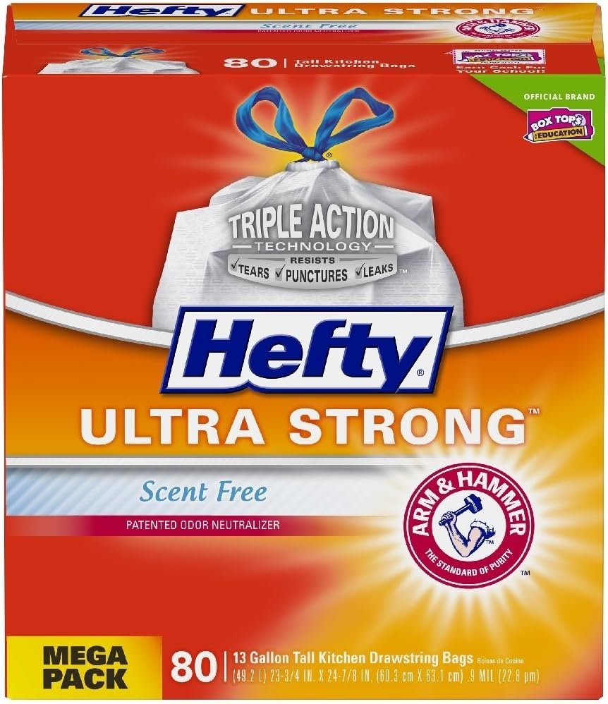 Trust Hefty Ultra Strong Tall Kitchen Trash Bags to keep your kitchen waste contained—all the way from can to curb. Thanks to Triple-Action Technology, these tough Hefty kitchen trash bags resist punctures, leaks, and tears, providing the highest protection available in flexible garbage bags. That stretchy strength means you don’t have to worry about unexpected bag breakage and inconvenient messes. Don’t be afraid to use these kitchen trash bags for tougher jobs, such as garage, basement and construction cleanup. A break-resistant grip drawstring makes it easy to close the bag and cart it away without incident. As a bonus, these unscented trash bags include a patented Arm and Hammer odor neutralizer to keep unpleasant smells at bay. All Hefty trash bags are backed by a 100% satisfaction guarantee.