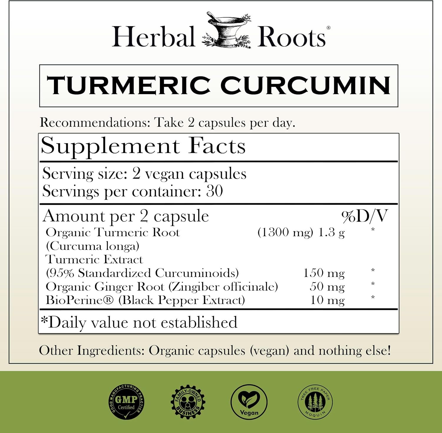 Ingredients: Organic turmeric root (Curcuma longa), turmeric extract (95% standardized curcumin), BioPerine (black pepper) extract, organic ginger root.
