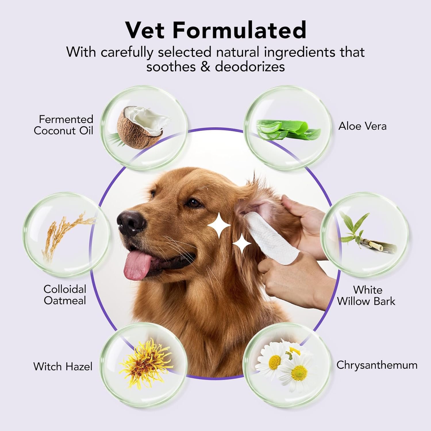 【All Natural Ingredients】The key natural ingredients of our dog ear cleaner wipes include: fermented coconut oil, colloidal oatmeal, witch hazel extract, white willow bark, chamomile extract, and aloe vera leaf juice. Gentle on your pets’ ears, our pet ear wipes are alcohol-free and free of parabens and fragrances, ensuring a soothing and non-irritating experience. Safe if licked or ingested.