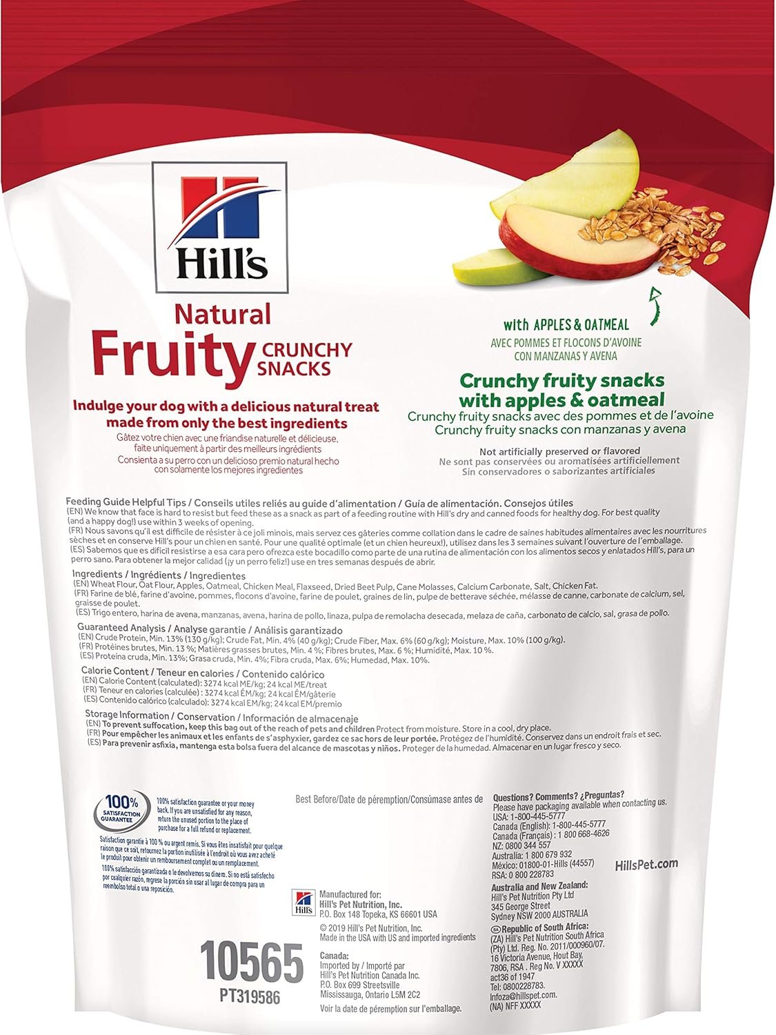Hill’s crunchy fruity snacks with Apples & Oatmeal dog treats are delicious, natural treats made from only the best ingredients. Every treat is baked with real fruit pieces and will make your dog happy. No artificial flavors or preservatives. *Hill’s 100% Satisfaction guarantee: We’re confident your pet will enjoy Hill’s foods. We’re so confident that we offer a 100% money-back guarantee. If you are unsatisfied for any reason, return the unused portion to Amazon for a full refund or replacement. For more information on returning an Amazon purchased product, visit the Amazon returns center.