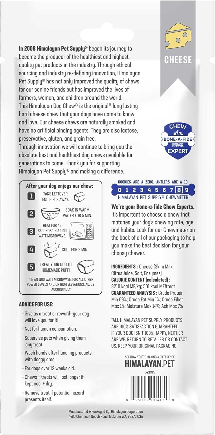 EXTRA LARGE Himalayan cheese chews – BEST for dogs 55 pounds and smaller. Chews sized right for your dog’s weight, temperament and activity level. 1 chew per pouch