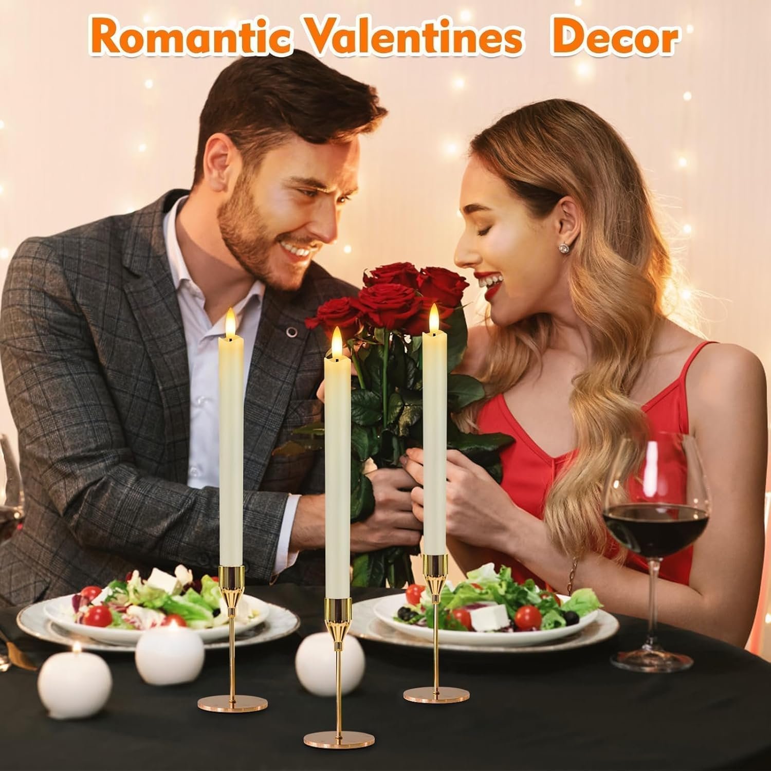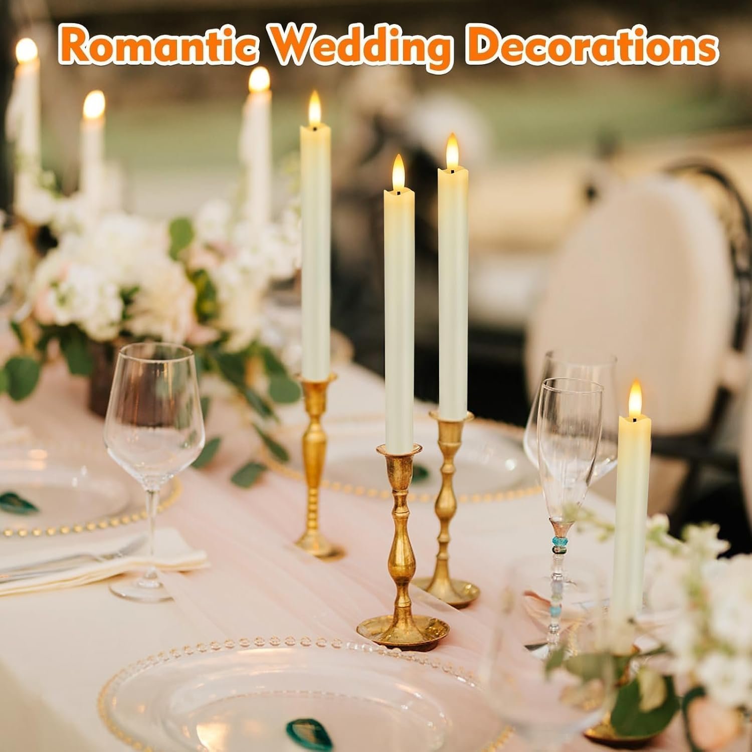 Realistic Flameless Candles: Super value set comes with 6 lifelike flameless taper candles and a remote control with 10 different keys. Classic LED taper candles with a pure wax coating and 3D wick flicker naturally and softly, look like real candles. Decorating your home with these battery operated candlesticks, definitely create a warm and cozy ambience.