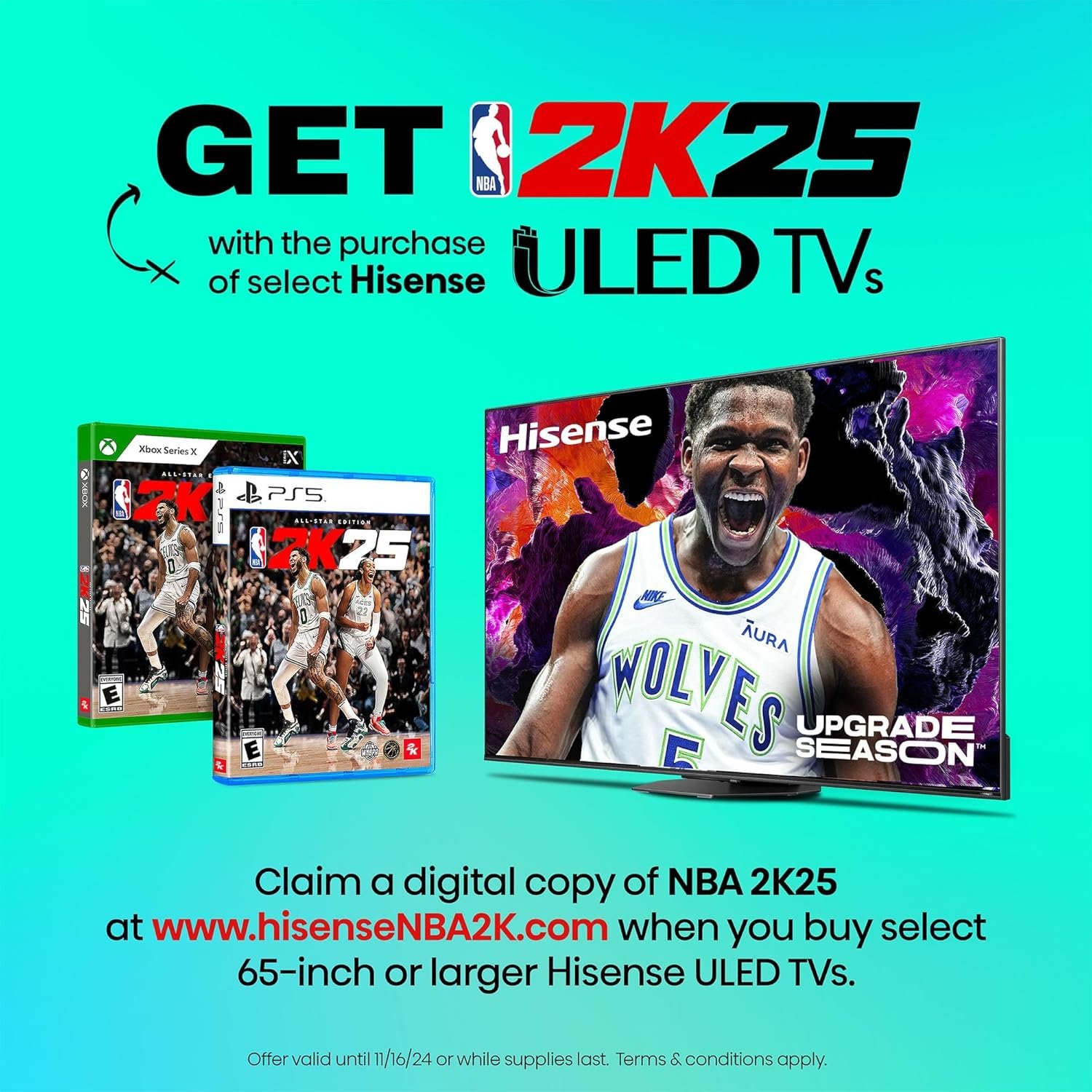 Get NBA2K25 with the purchase of select 2024 Hisense ULED TVs, sizes 65″ and larger. Visit HisenseNBA2K.com to redeem your reward after you complete your purchase.