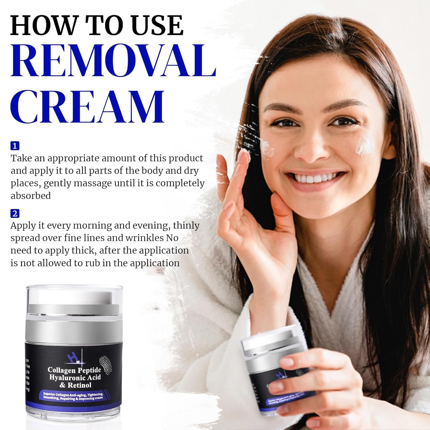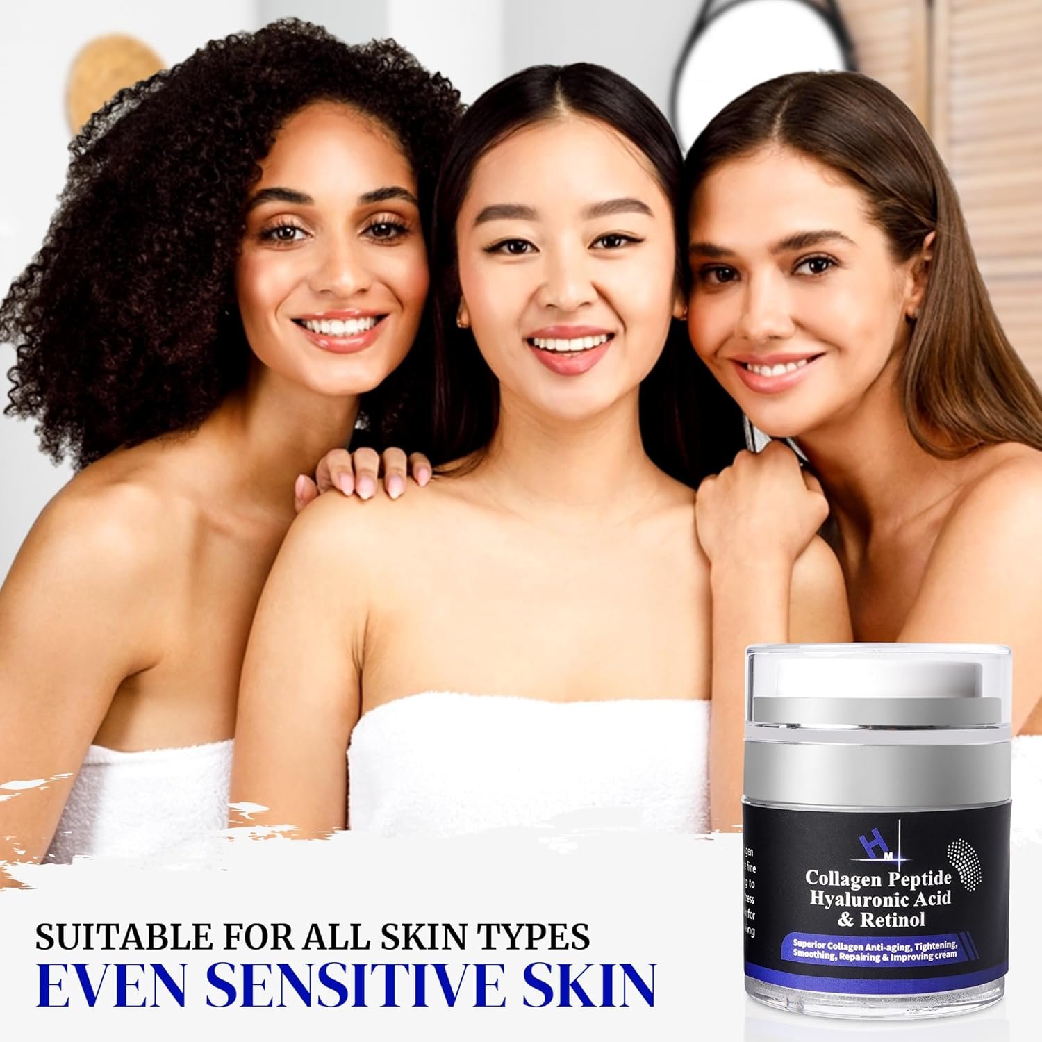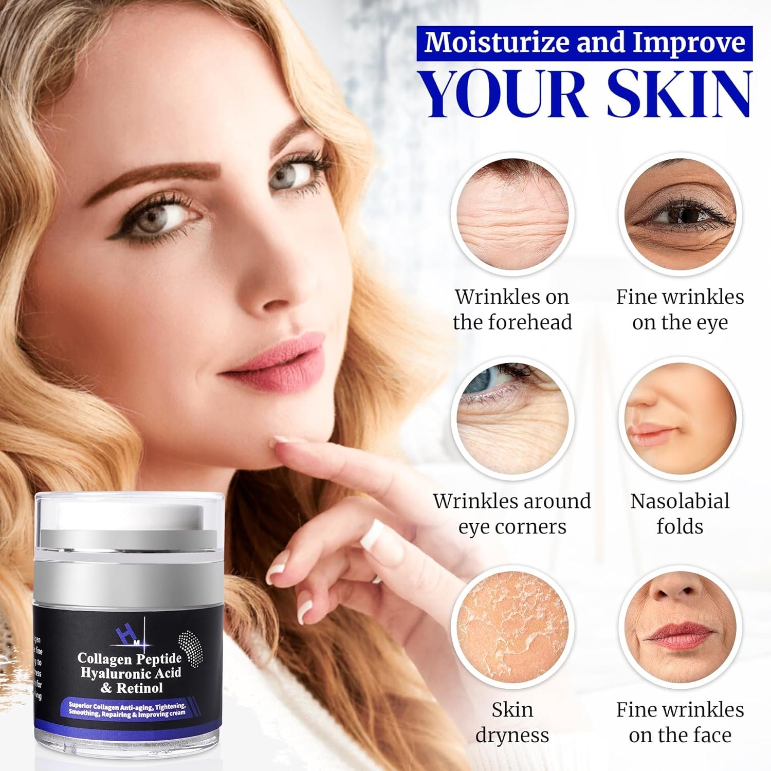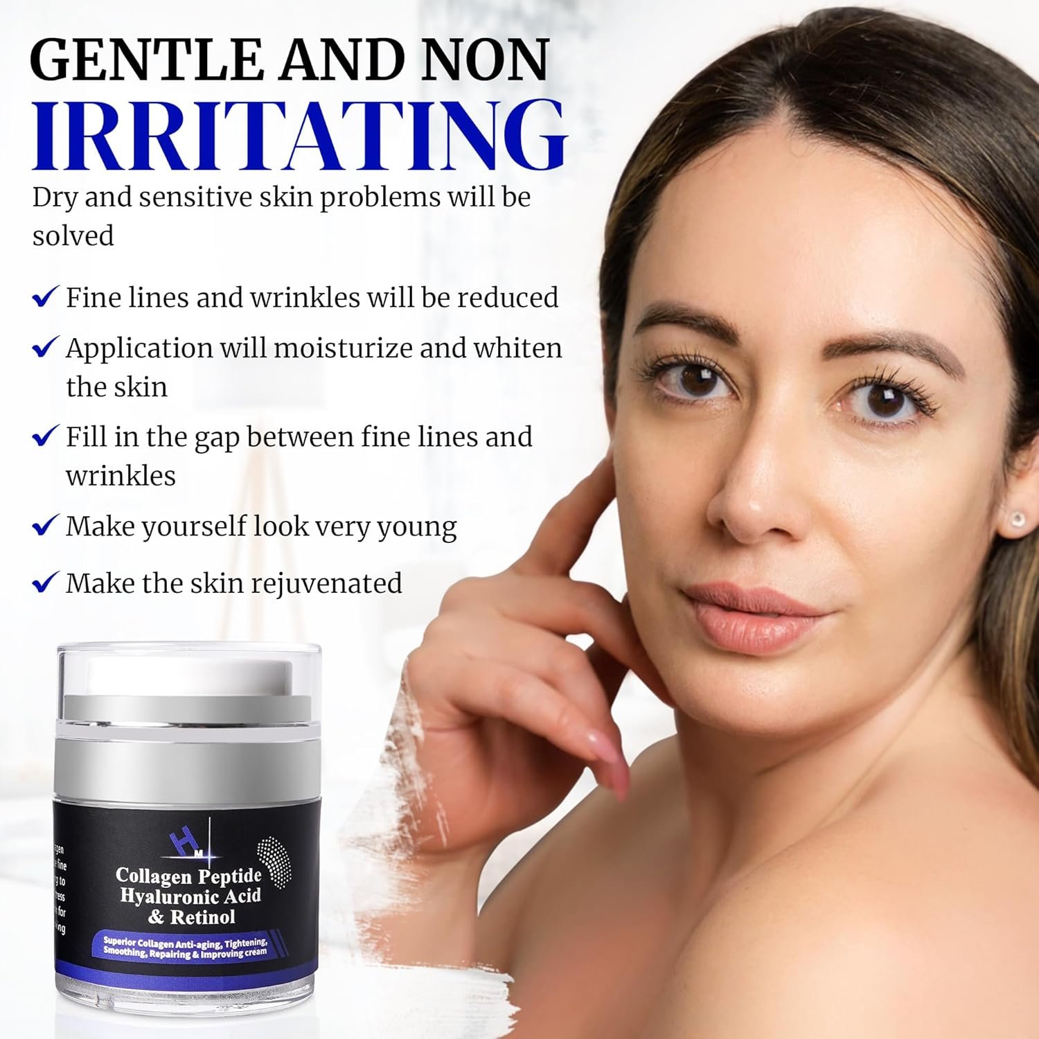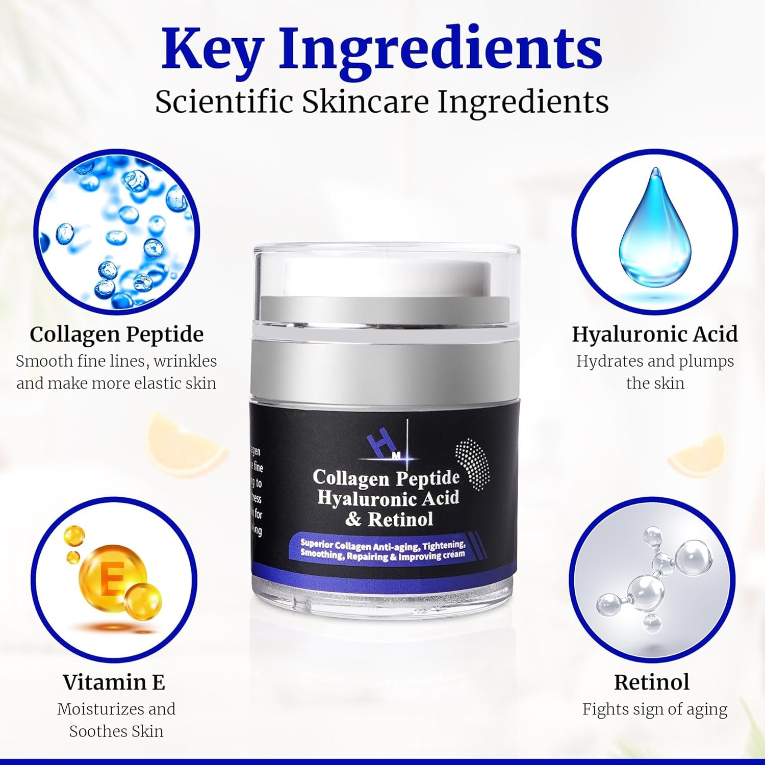 * Collagen Peptides *: Helps to firm and strengthen skin, reducing the appearance of fine lines and wrinkles. * Hyaluronic Acid *: Deeply hydrates and plumps the skin, enhancing moisture retention for a smooth, youthful appearance. * Retinol *: Supports skin renewal, minimizing visible signs of aging like wrinkles and age spots. *Vitamin E *: Acts as a powerful antioxidant, protecting skin from environmental damage and enhancing radiance.