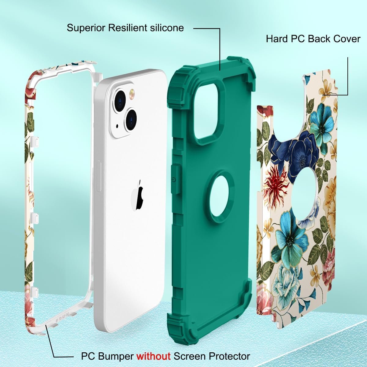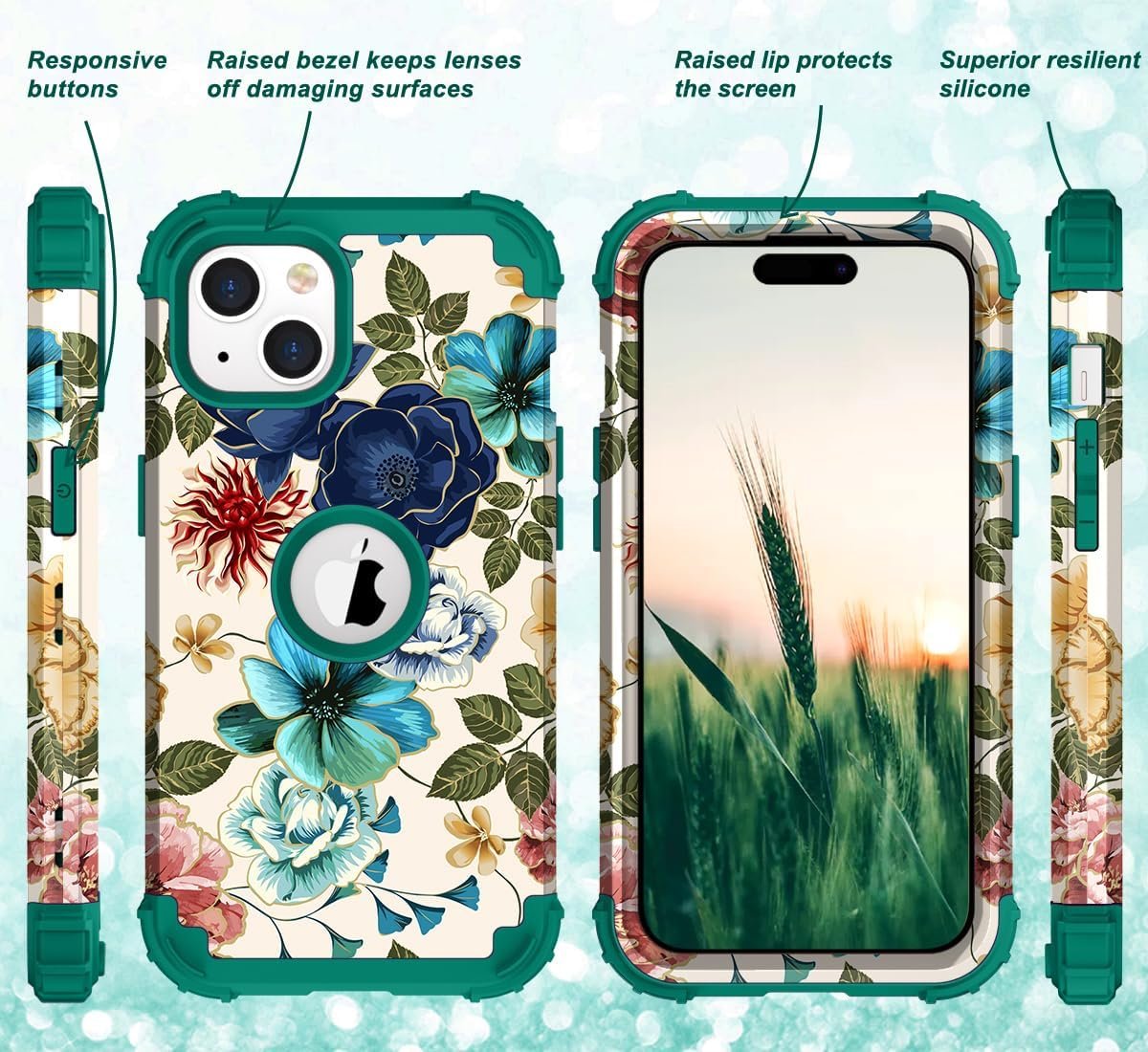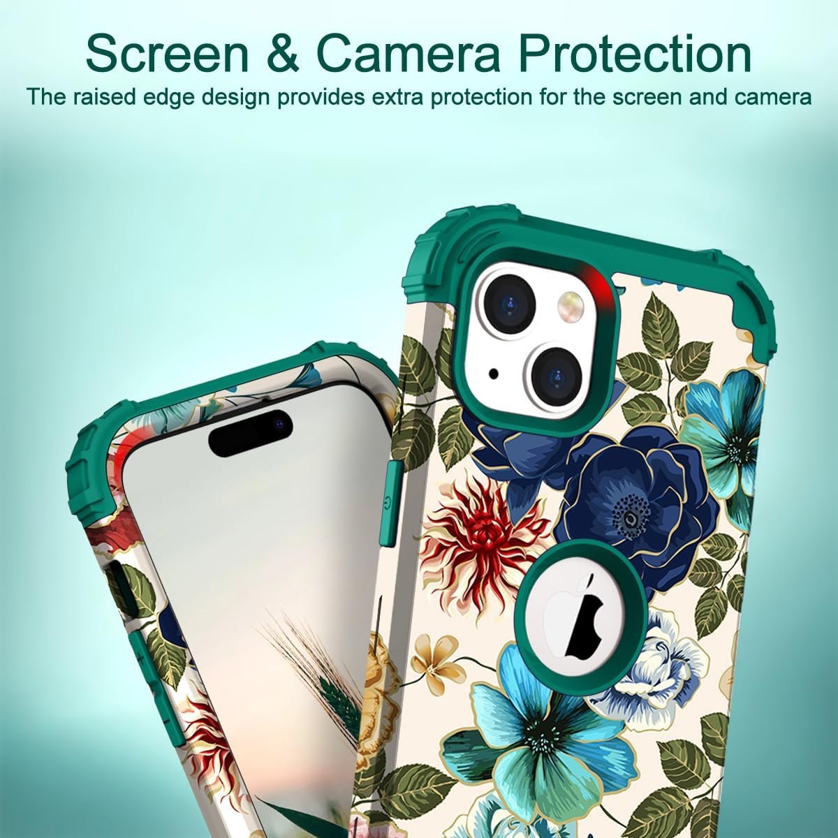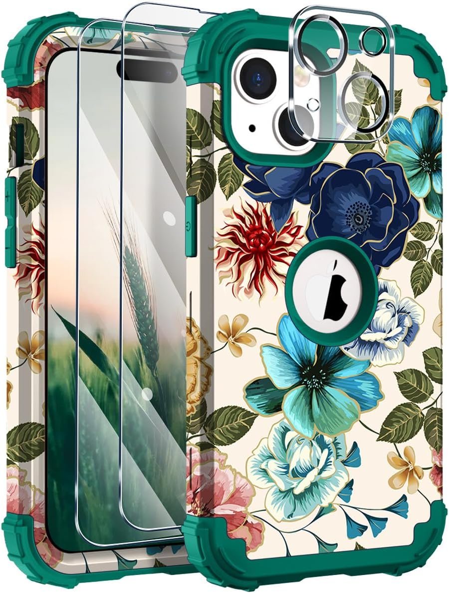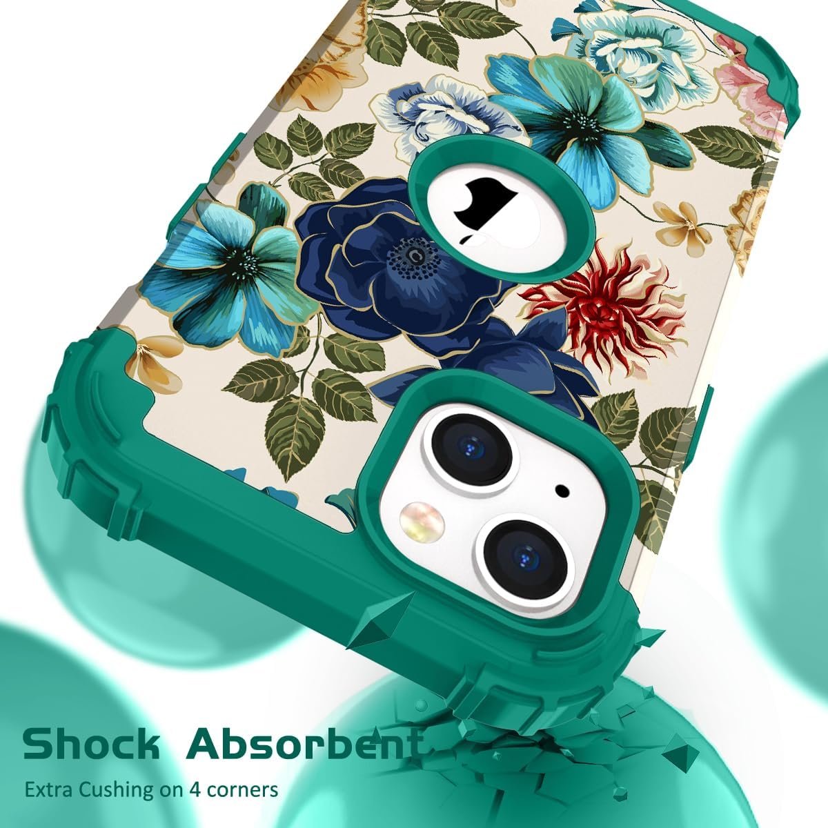 Hocase for iPhone 15 Case 6.1″, with 2pcs Screen tectors and 1pc Camera tector, Shockof Heavy Duty Soft Silicone+Hard PC Hybrid tective Case – Teal Flowers