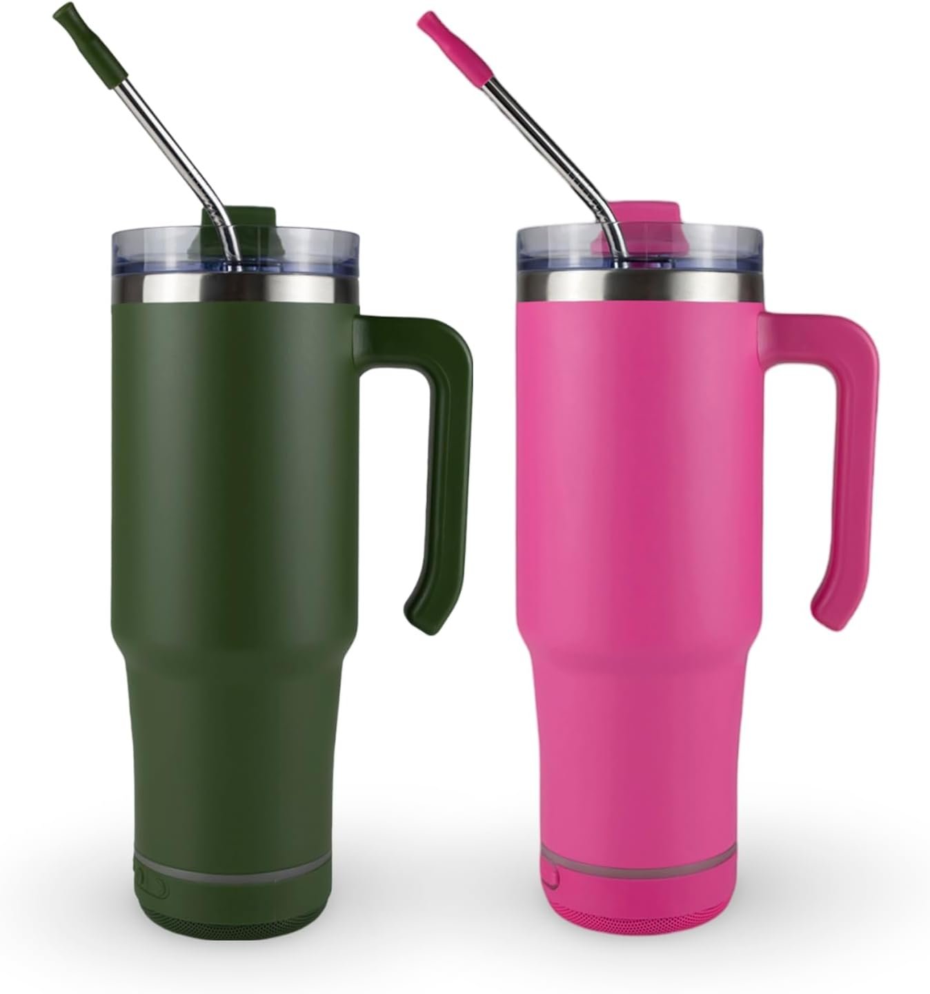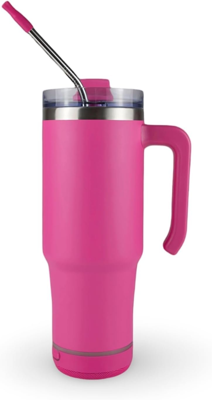 【SPEAKER TUMBLER】Elevate your beverage experience with a pink tumbler with handle that comes with a high quality loud bluetooth speaker. Perfect for your tailgate, vacation, or a gift for a music lover.