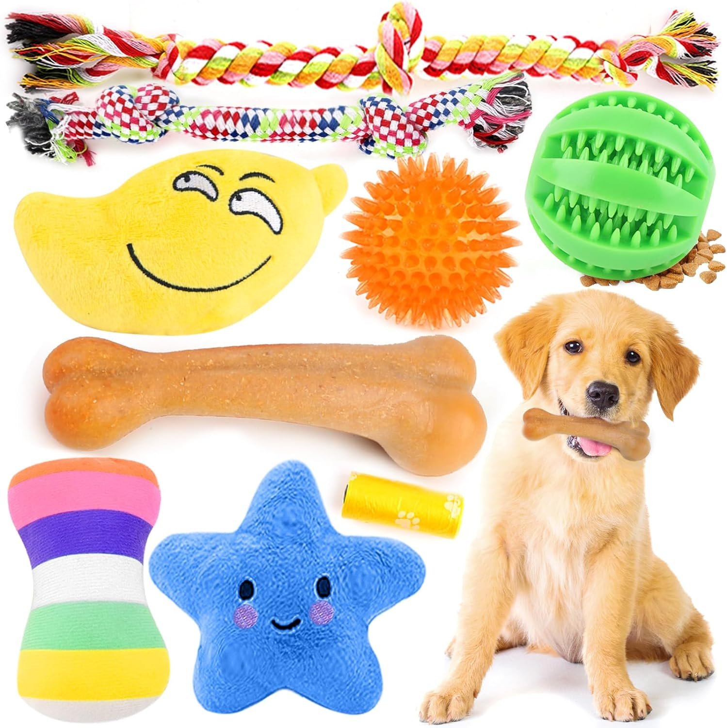 🐾【Puptily Dog toys 】Our 9 Pack dog toy set is perfect for small dogs, puppies, and even medium Breed dogs. It features a variety of interactive toys, including 3 dog squeaky toys, 2 tough dog rope toys, a durable dog ball and natural rubber toys, a dog chew toys bone and waste bag. With puppy toys for boredom and stimulating, Keeps your lovely puppy happy and busy.