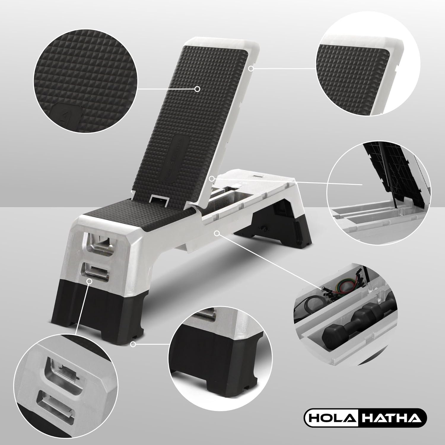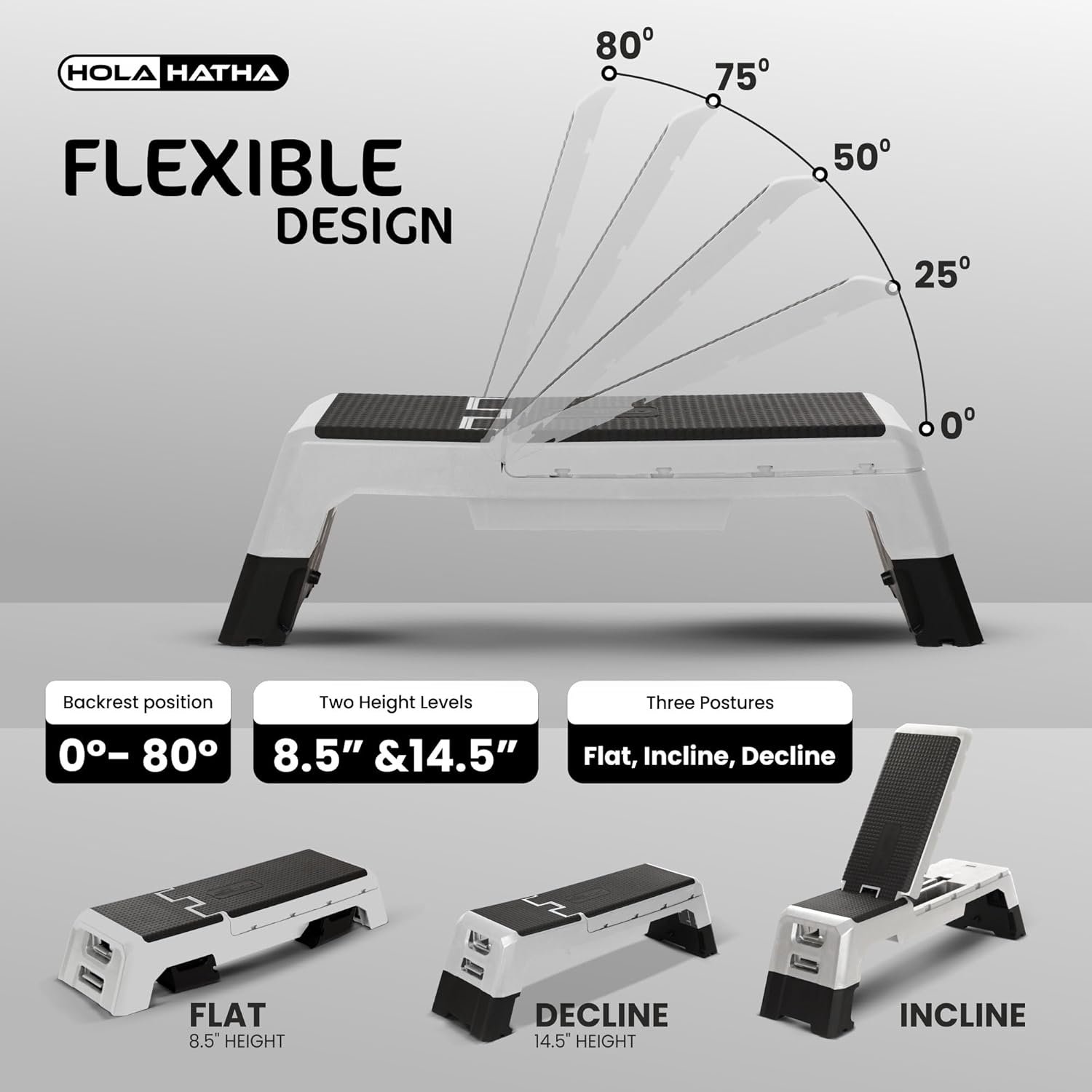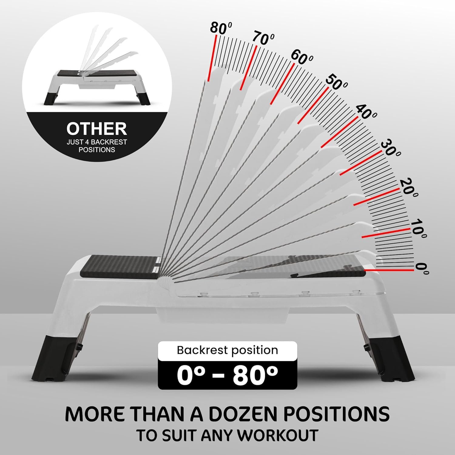 Adjustable Positioning: Multifunctional aerobic deck with multiple backrest potions from 0 to 80 degrees, 2 height levels, and 3 posture levels from flat, include, decline with firmly locked legs that ensure stability