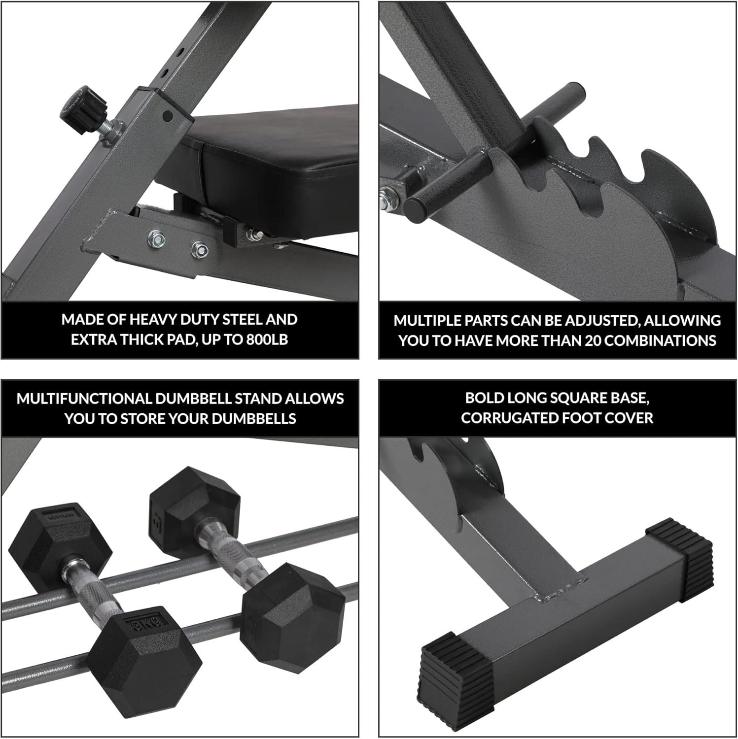 Versatile multifunctional weight training bench lets you exercise your arms, abs, back, chest, glutes, hamstrings, and core with ease and can support up to 800 pounds of weight capacity