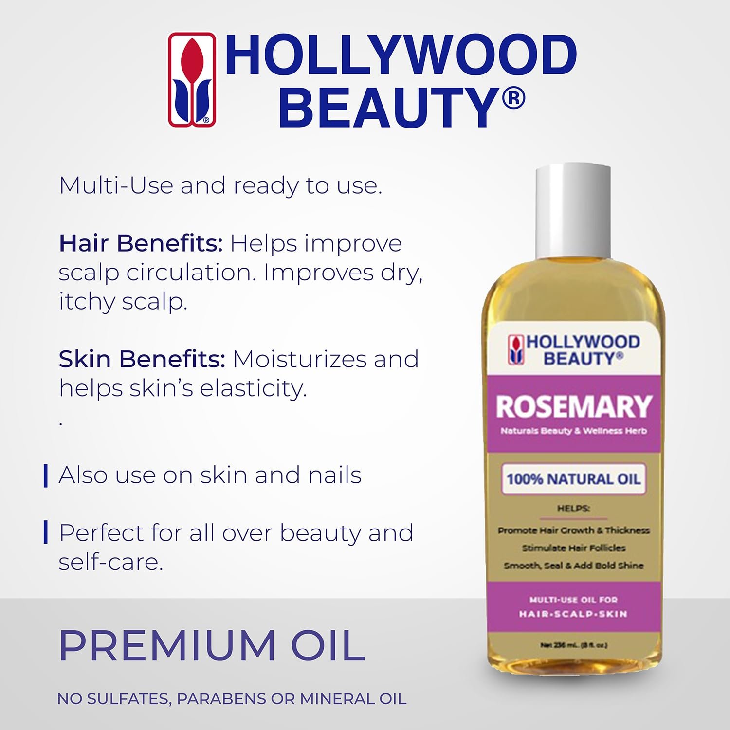 Elevate your beauty to Hollywood levels! Hollywood Beauty Rosemary Oil for Hair, Scalp, and Skin encourages growth and moisturizes the scalp, hair, skin, and even nails. Made with the healing, wellness, and growth promoting benefits of Rosemary, this premium oil helps improve scalp circulation and dry, itchy scalp. It helps skin elasticity and strengthens weak, brittle nails. Formulated with essential extracts and no sulfates, parabens, or mineral oil, this beauty oil is vital for total hair care, body care, and self-care. Use as a growth helper, by gently massaging a small amount on to the areas of slow growth. To use as a hot oil treatment, place the bottle in a cup of warm water. Apply evenly throughout hair and scalp. Cover with a warm, moist towel for up to 30 minutes, then rinse and style. To use as a nail treatment, mix with warm water and soak for up to 20 minutes. Get your fix with a mix of this Rosemary oil and any of our Hollywood Beauty multi-use, multi-functional oils to fix and transform hair, scalp, skin, and nails.