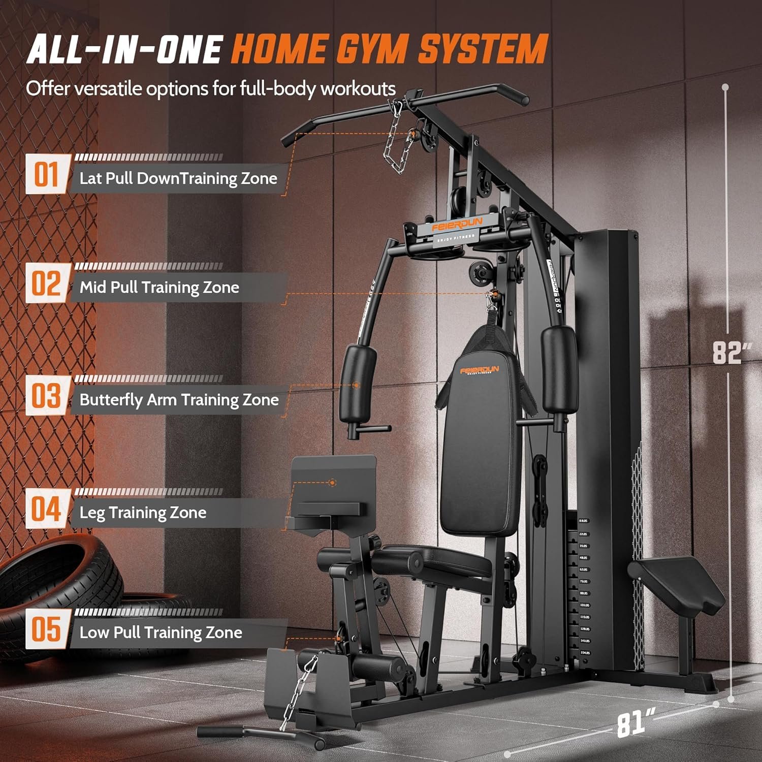 All-in-one Gym: FEIERDUN home gym offering offers a variety of versatile exercises, including leg press, chest press, lat pulldown, leg extension and more; With 11+1 adjustable weight pieces totaling 154lbs,customize your workout intensity to match your fitness goals