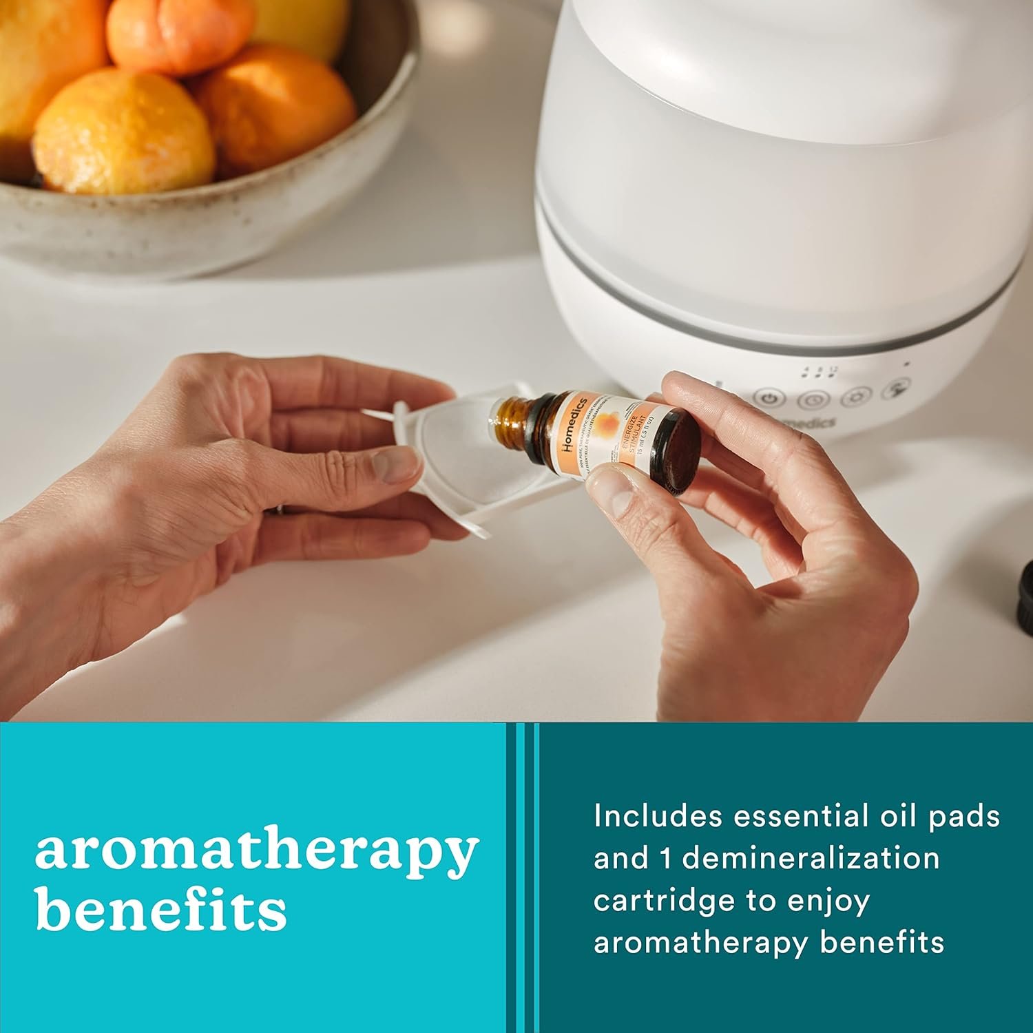 WHAT’S IN THE BOX – (1) Homedics TotalComfort Large Humidifier, (1) Instruction Book, (3) Essential Oil Tray Pads, (1) Demineralization Cartridge, (1) 2-Year Warranty