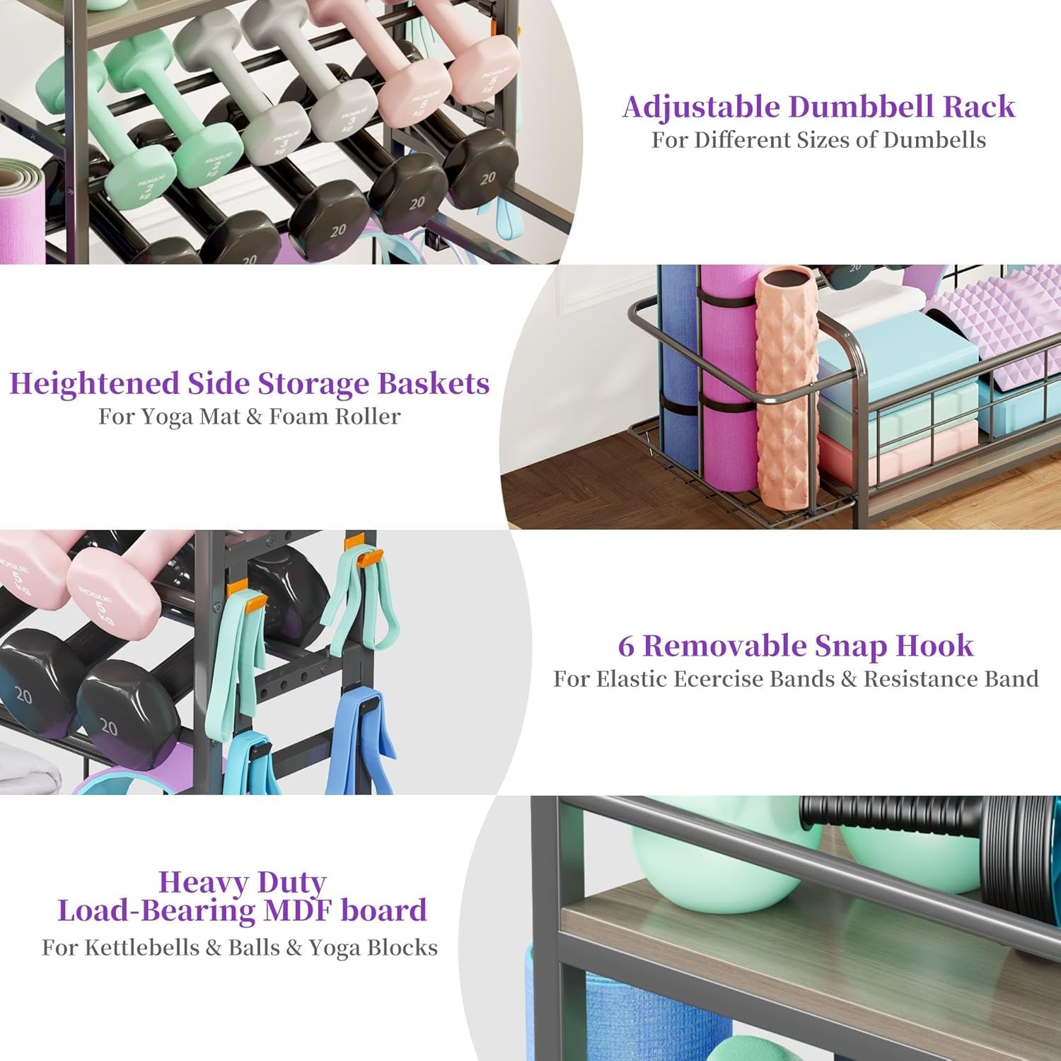 ALL-IN-ONE HOME GYM STORAGE RACK: This weight storage racks is equipped with top plank layer for storing kettlebells, 2-layer dumbbell rack,a side basket for storing yoga mat and foam rollers, 6 side hooks for fitness resistance band,bottom storage rack is perfect for storing balls, yoga blocks and other exercise equipment.Perfect for organizing your various gym equipment into one storage rack, easy to save your space and stay organized
