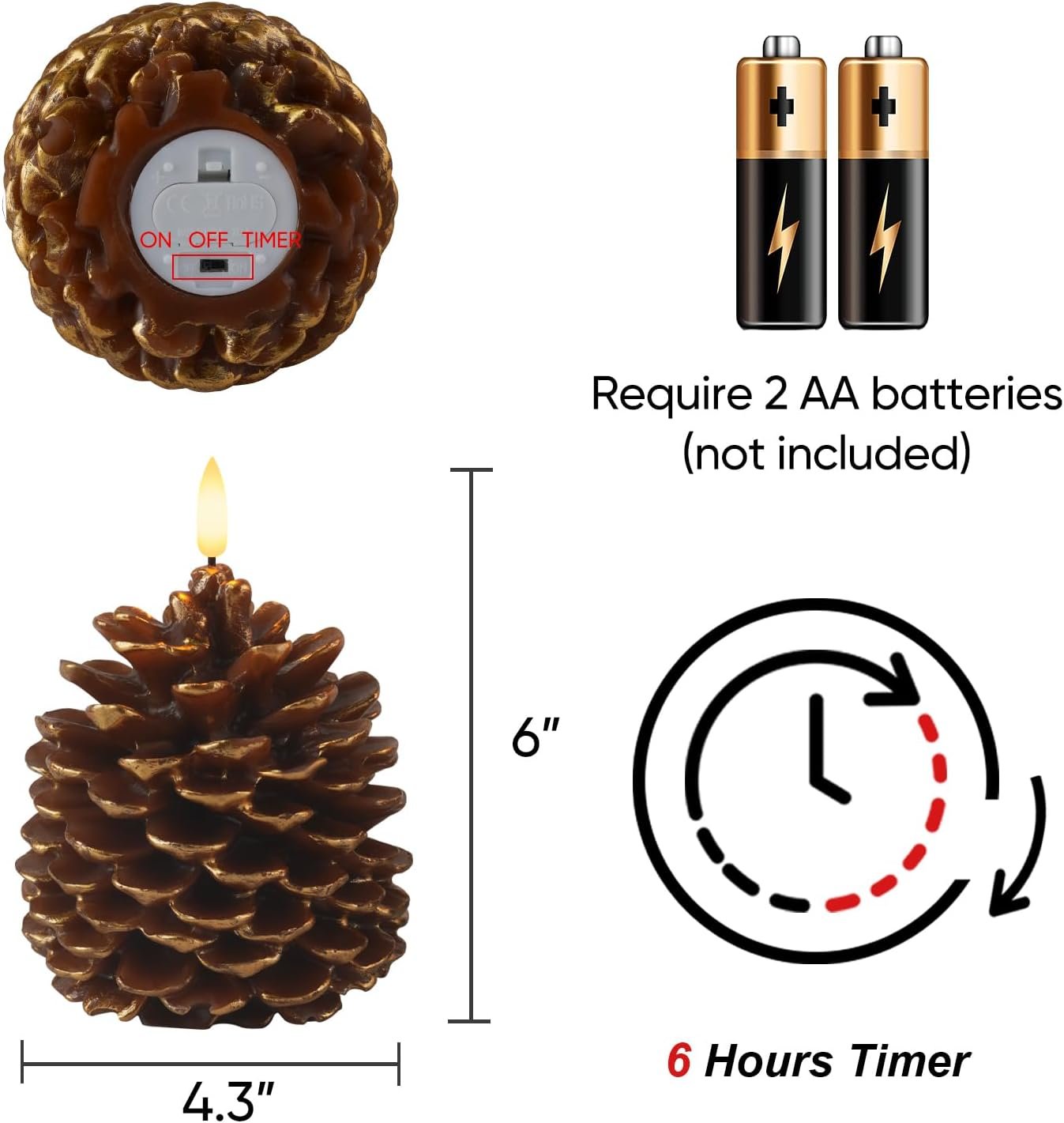 Long Lasting: These electronic candles are powered by 2 AA batteries (batteries not included). The power saving timer not only makes the candles brighter, but also extends the life of the electric candles. When the flameless pine cone candle is lit, the warm LED light will gently flicker, creating a beautiful and dreamy Christmas atmosphere.