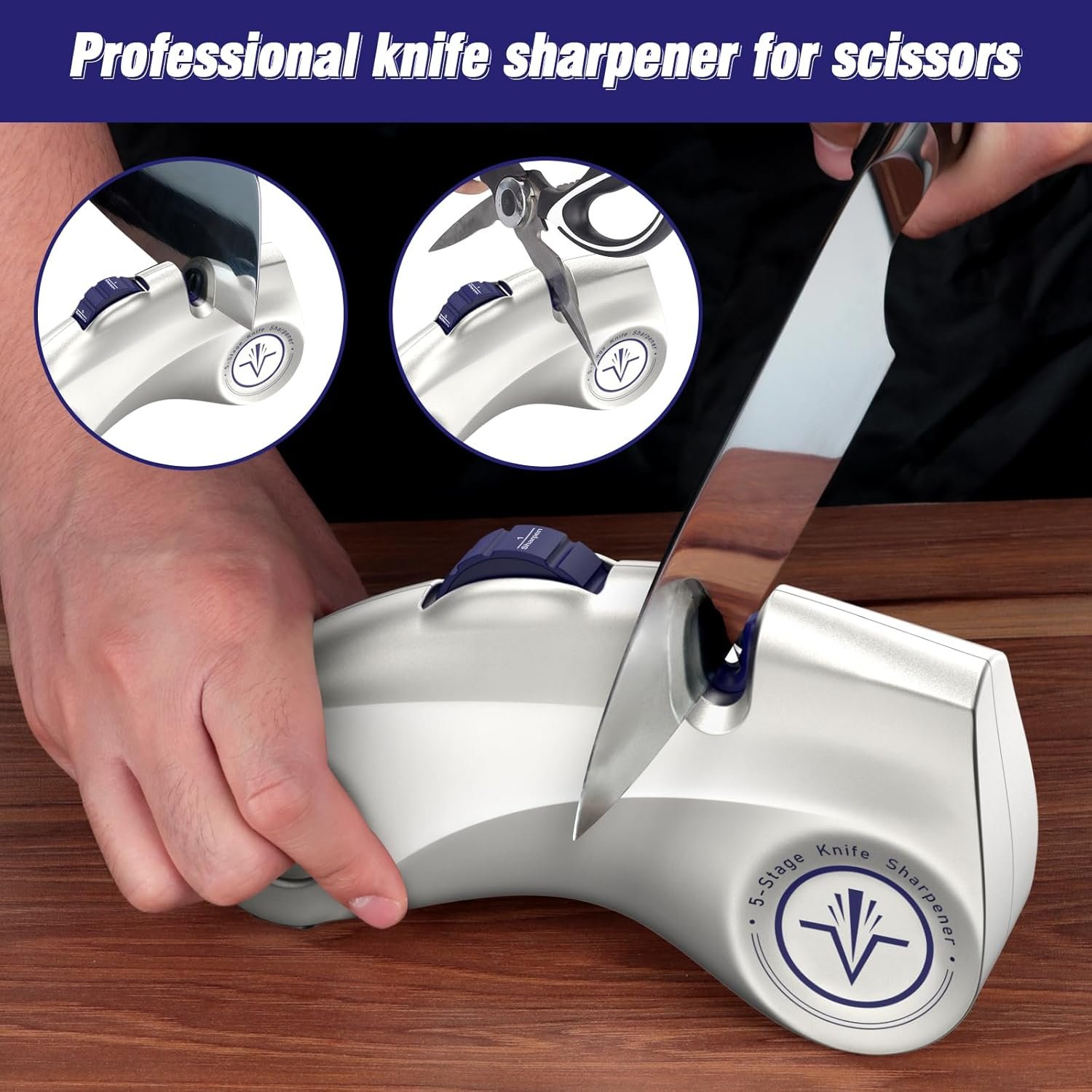 đăProfessional 5-in-1 SharpenerăSelect”1″ “2” “3” for knives shrpening, where “1” is coarse sharpening, “2” is medium sharpening, and “3” is fine sharpening. Select “4” for bREAD knives, Select “5” for scissors sharpening, put the knife into the grinding slot, then slightly pull the knife along the blade from the heel to the tip. Following the instructions, you will receive a new tool.