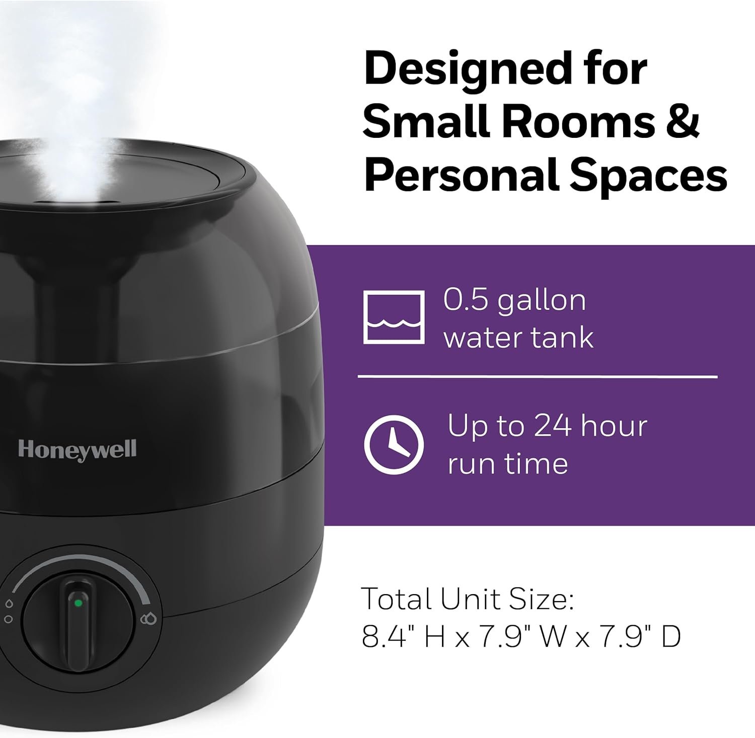 The Honeywell Mini Cool Mist Humidifier (HUL525B) provides a soothing, cool mist without taking up too much room! During cold and flu season or when the air is simply just dry, you can rely on this small humidifier for your entire family. Its compact size makes it ideal for desktops or nightstands. Honeywell humidifiers for bedroom and beyond add necessary moisture to the air, and help ensure proper humidity levels in your home. Indoor humidity levels between 40-60% can help relieve cough and congestion, keep throat and nasal passages hydrated, temporarily relieve dry air discomfort, protect furniture, reduce static electricity and even keep plants healthier. This Honeywell humidifier is a cool mist humidifier, and produces a fine, visible cool mist with a directional mist outlet. It has no filter to change, an ultra-quiet operation and variable output settings to let you customize the moisture level in the air, making it a great choice for your family, even as a kids or baby humidifier. Plus, it has an essential oil tray, large tank opening that makes it easy to fill and clean, no filters to replace and it automatically shuts off when empty. It features an up to 24 hour run time.