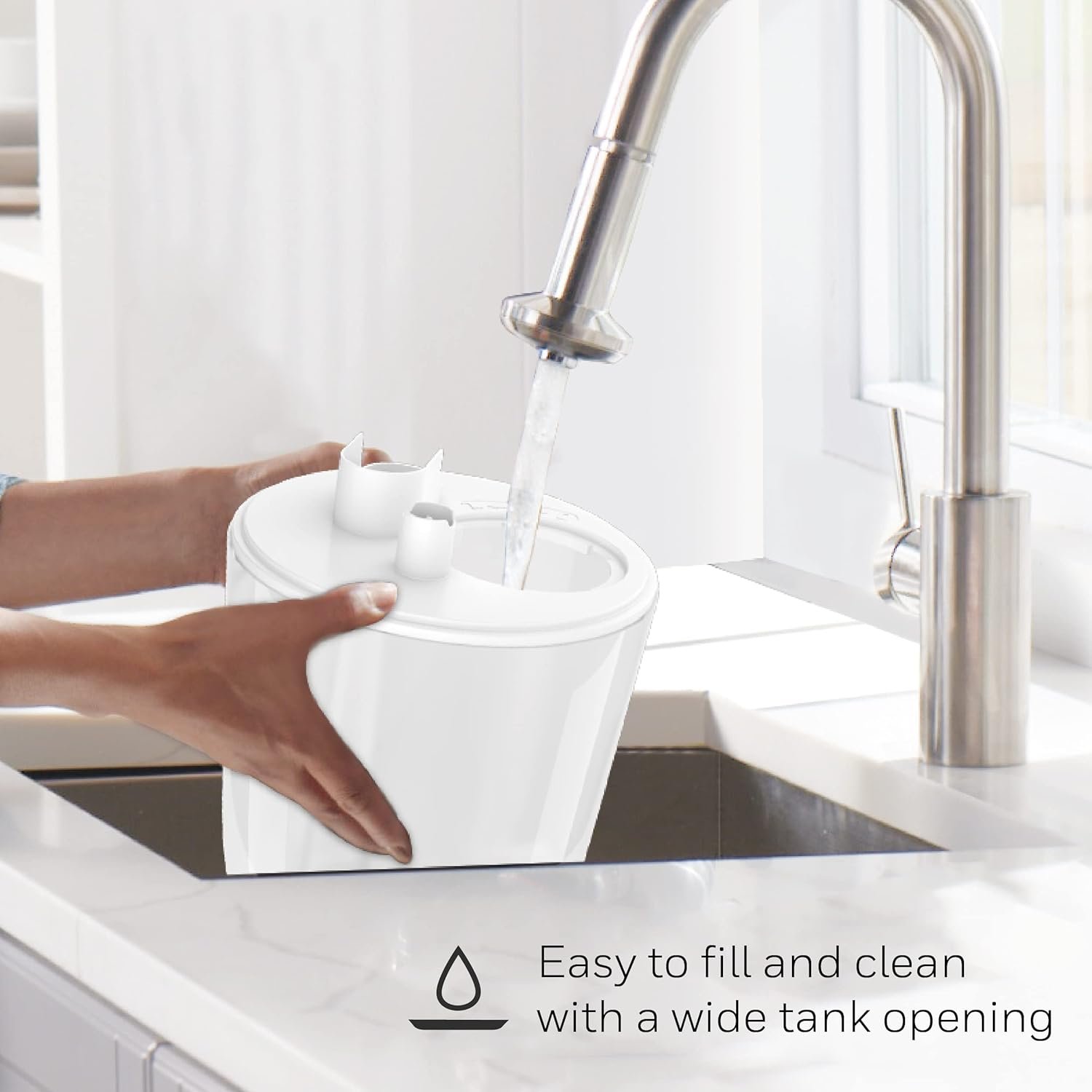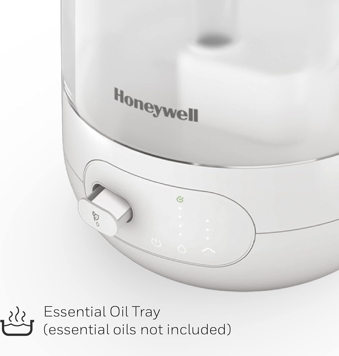 The Honeywell Ultra Plus Cool Mist Humidifier (HUL565) provides a soothing, cool mist. During cold and flu season or when the air is simply just dry, you can rely on this humidifier for your entire family. It has a compact footprint to fit on desktops or nightstands, but large capacity and is ideal for large-sized rooms. Honeywell humidifiers for bedroom and beyond add necessary moisture to the air, and help ensure proper humidity levels in your home. Indoor humidity levels between 40-60% can help relieve cough and congestion, keep throat and nasal passages hydrated, temporarily relieve dry air discomfort, protect furniture, reduce static electricity and even keep plants healthier. This Honeywell humidifier is a cool mist humidifier, and produces a fine, visible cool mist with a dual direction mist outlet. It has an ultra-quiet operation and an adjustable digital humidistat with 4 preset comfort levels to let you customize the moisture level in the air, making it a great choice for your family, even as a kids or baby humidifier. Plus, it has an essential oil tray, large tank opening that makes it easy to fill and clean, no filters to replace and it automatically shuts off when empty. It features an up to 40 hour run time.