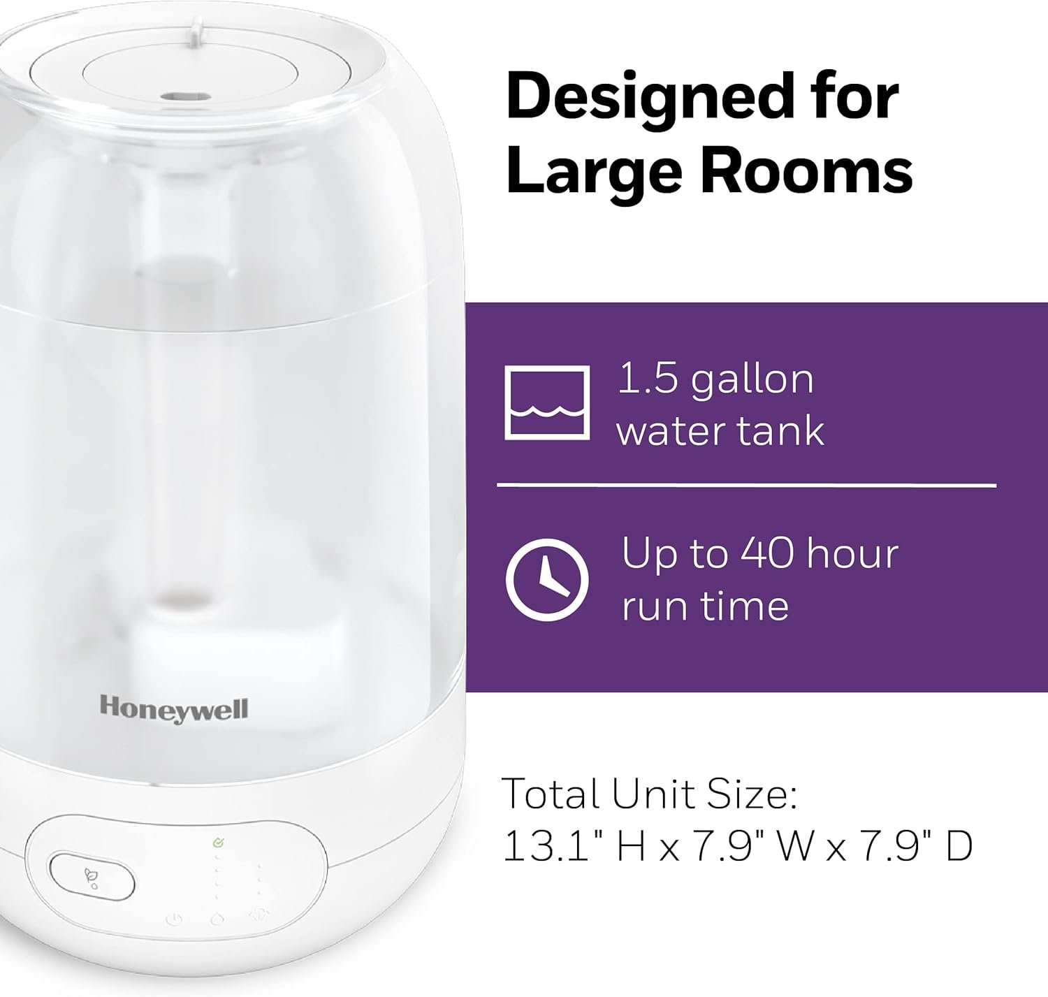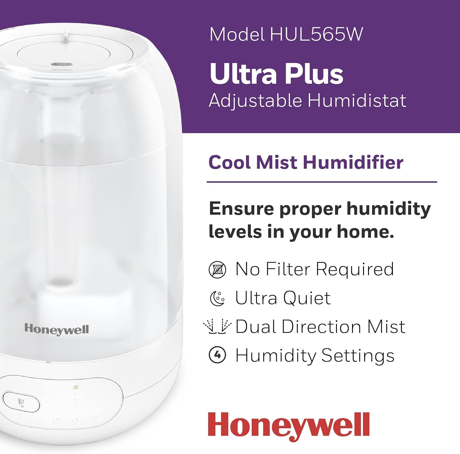 COOL MIST HUMIDIFIER – Honeywell Ultra Plus Cool Mist Humidifier (HUL565) has a small footprint but large 1.5 gallon capacity, and helps ensure proper humidity levels in large rooms. Indoor humidity between 40-60% can help relieve dry air discomforts.