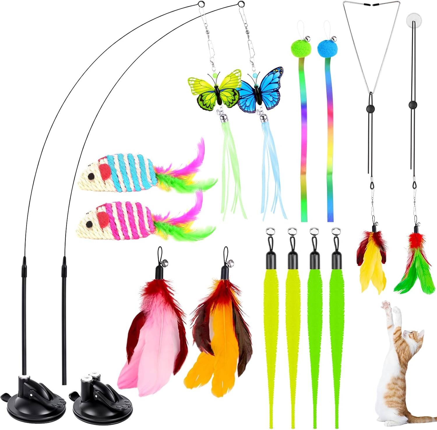 14 Pcs Cat Teaser Toys: The set includes 1 single-end suction cup, 1 double-end suction cup, 2 cat wands, 4 feather toys, 4 worm toys, 2 butterfly toys, 2 mouse toys, 2 ribbon toys, 2 ropes, 2 sticky pads and 1 triangle clip. All parts are detachable and feature a detailed bell to stimulate your cat’s hunting instincts, give your cat some exercise, and help keep a bored cat interested!