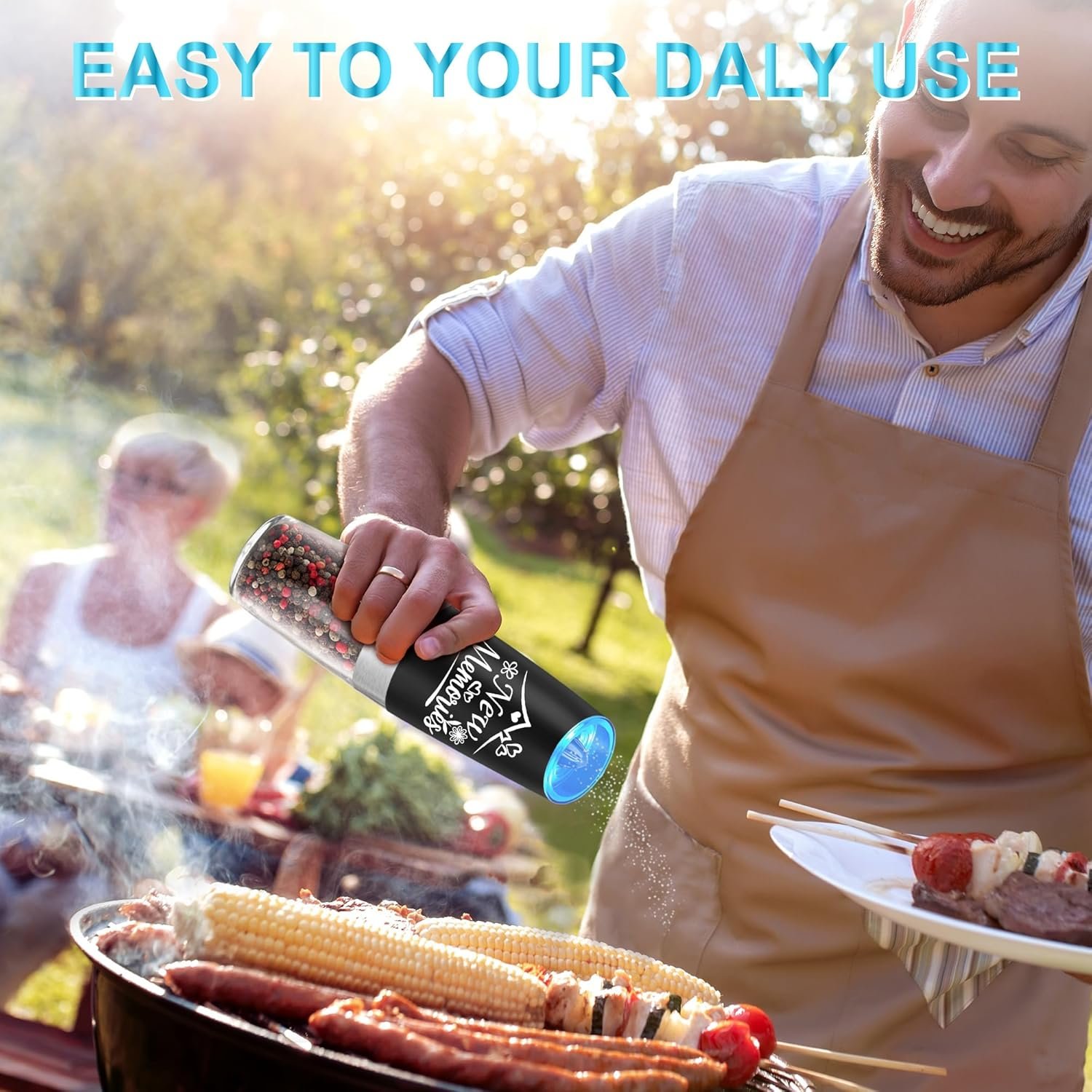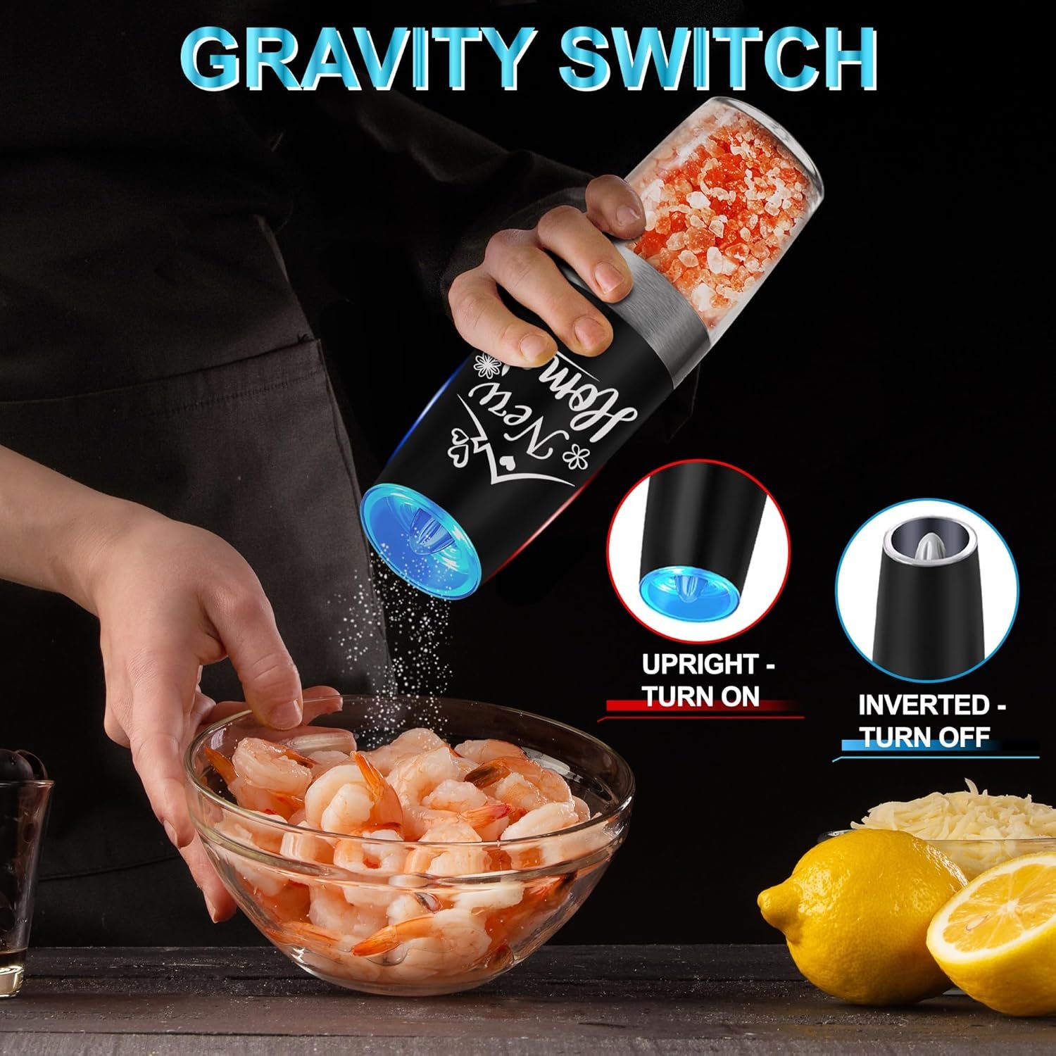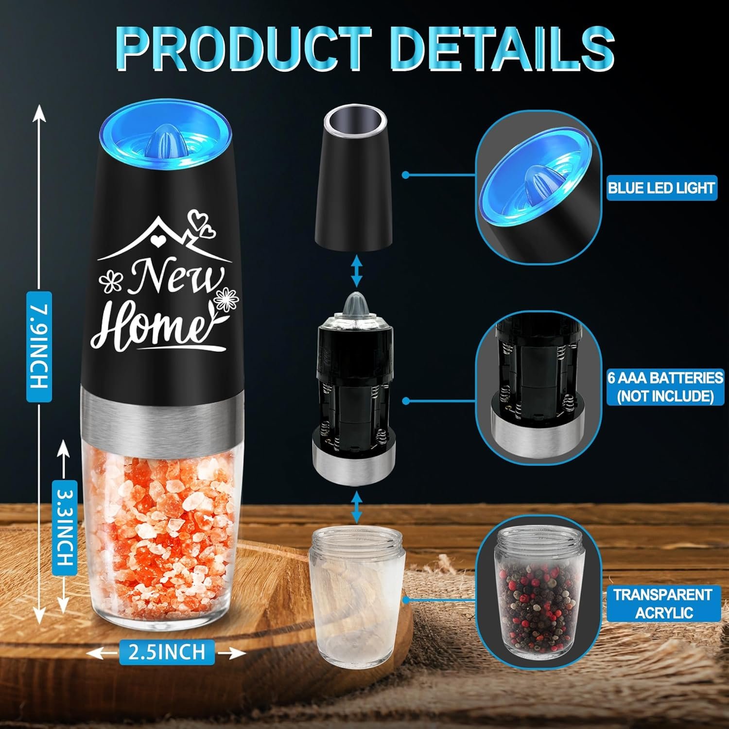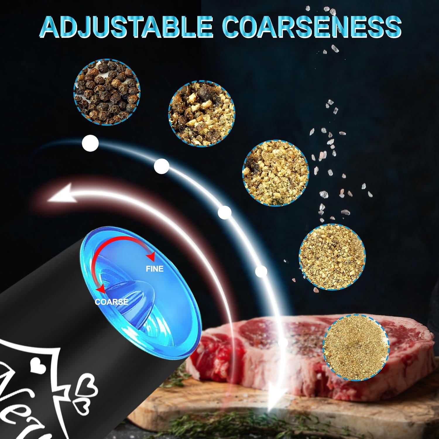 ADJUSTABLE GRINDER – You can choose the coarseness of your salt and pepper by turning the adjustment knob at the head of the automatic salt and pepper grinder set. The LED blue light keeps on while grinding as a reminder.