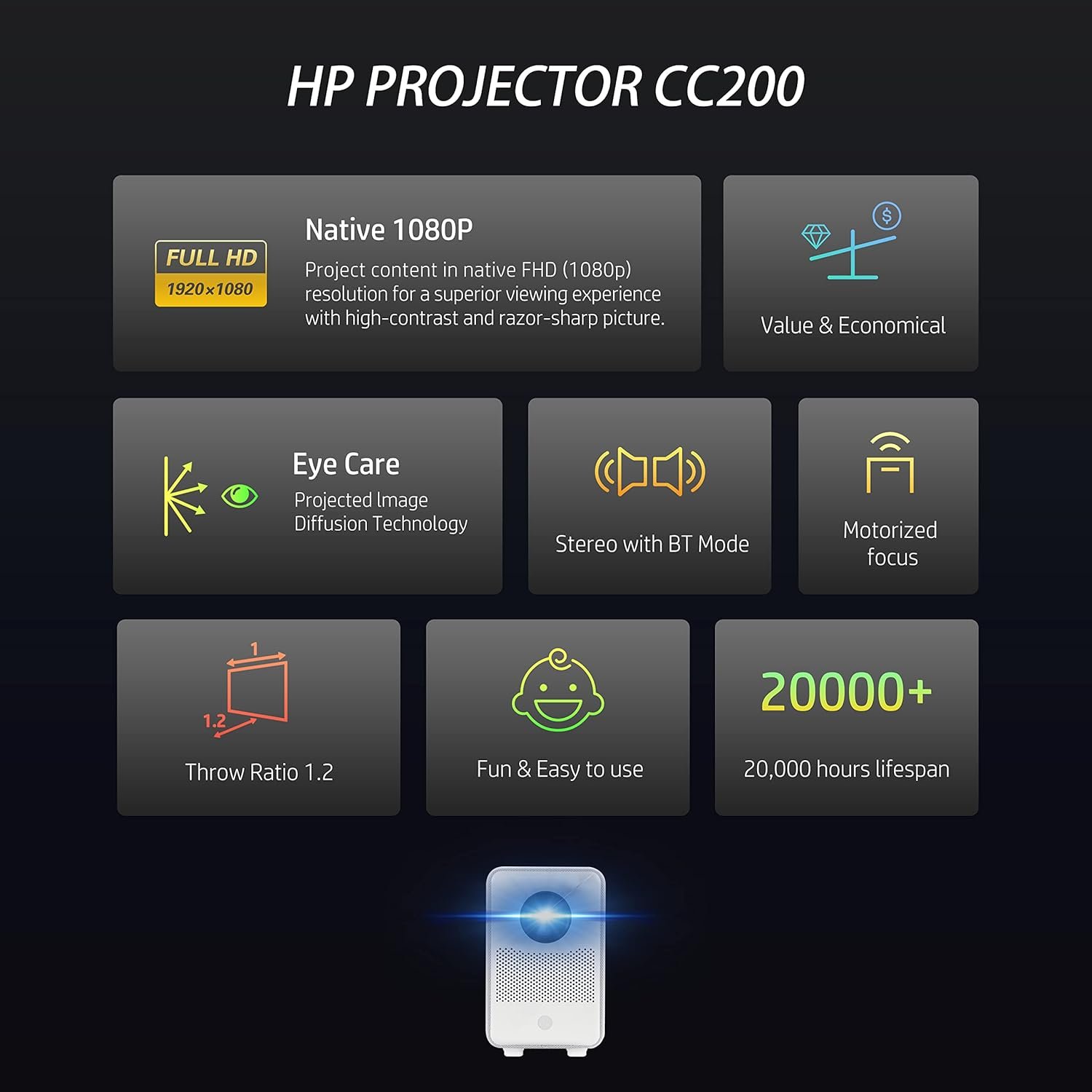 HP Projector CC200 Promo (3 in 1) includes HP CC200 Full-HD (1920×1080) LED Projector bundled with Roku Express Streaming Player and 84 inch Portable Projection Screen. Plug and project with the HP CC200 projector in native Full-HD (1920×1080) resolution that delivers stunning clarity with vivid color and detail. Enjoy super-sized entertainment on a 84″ Portable Projection Screen and by connecting Roku Express streaming player to the HDMI port of HP CC200. Dual USB ports provide further convenience to access your content on flash storage and input devices such as a mouse and keyboard simultaneously. It features the latest generation LED light source (lamp-free) in sealed LCD optical engine that is dust-proof and with 20,000+ hours of life. You can enjoy a lifetime of multimedia experiences with consistent brightness and zero maintenance. With a portable lightweight design, 1.2 throw ratio lens, built-in 6W speakers, you can enjoy a cinema-like experience even in compact spaces, in any room or space.