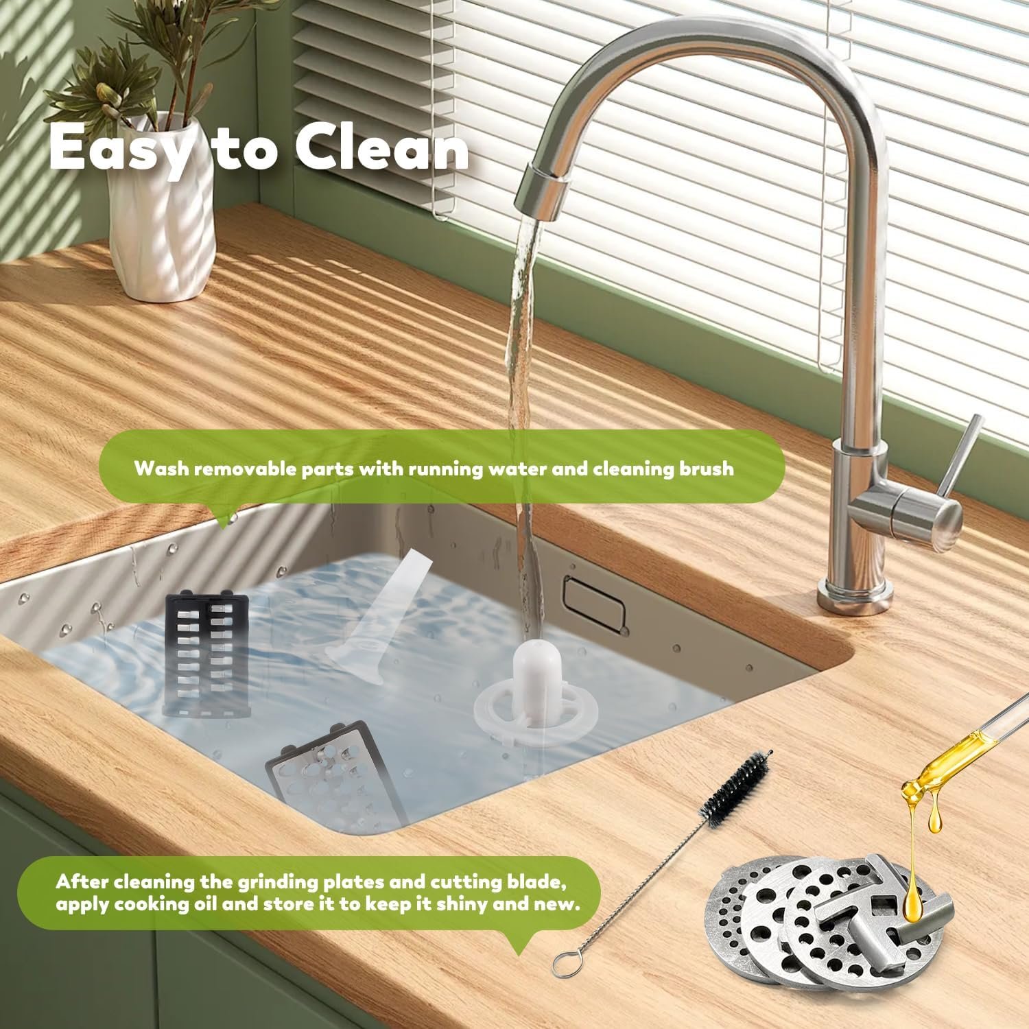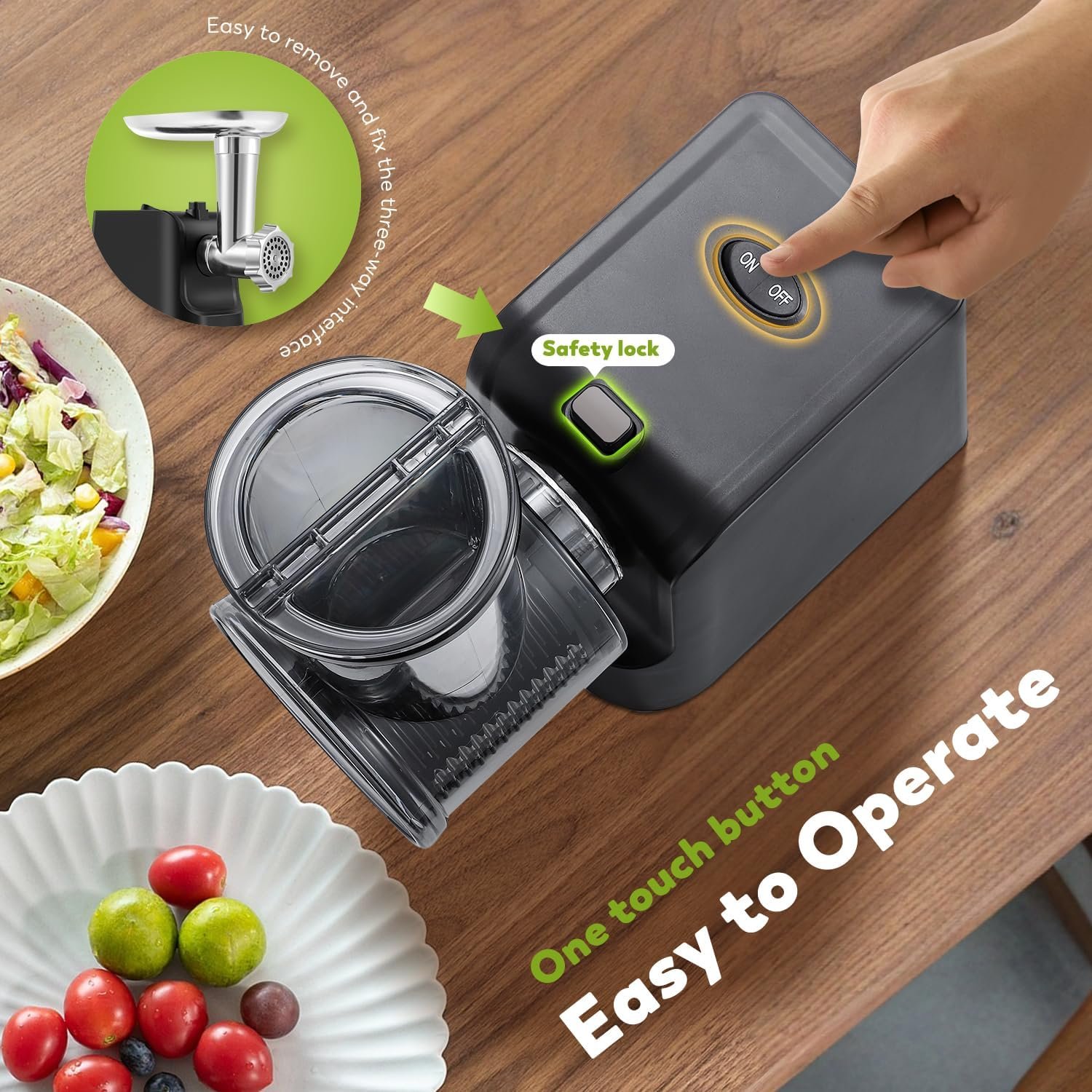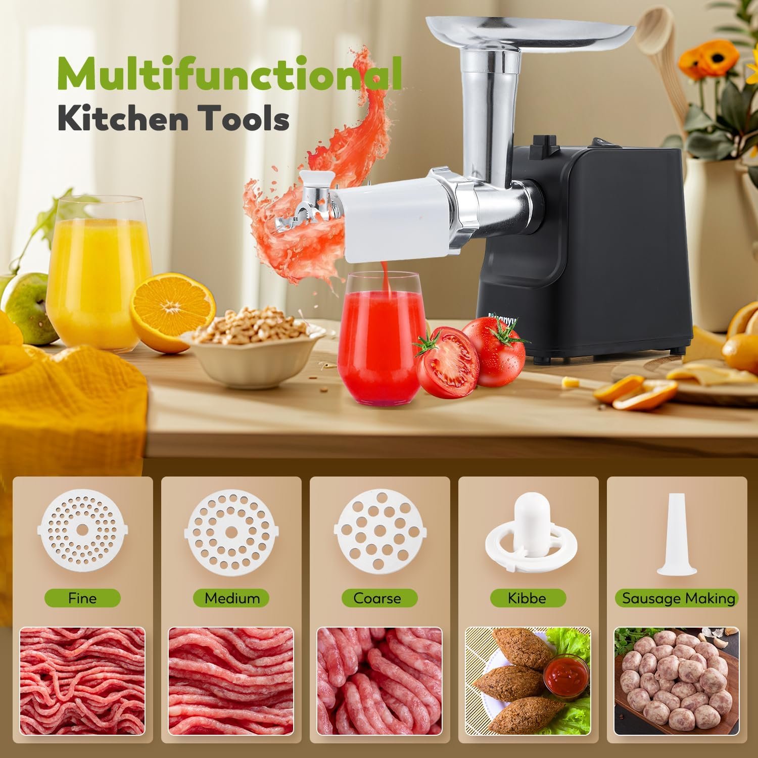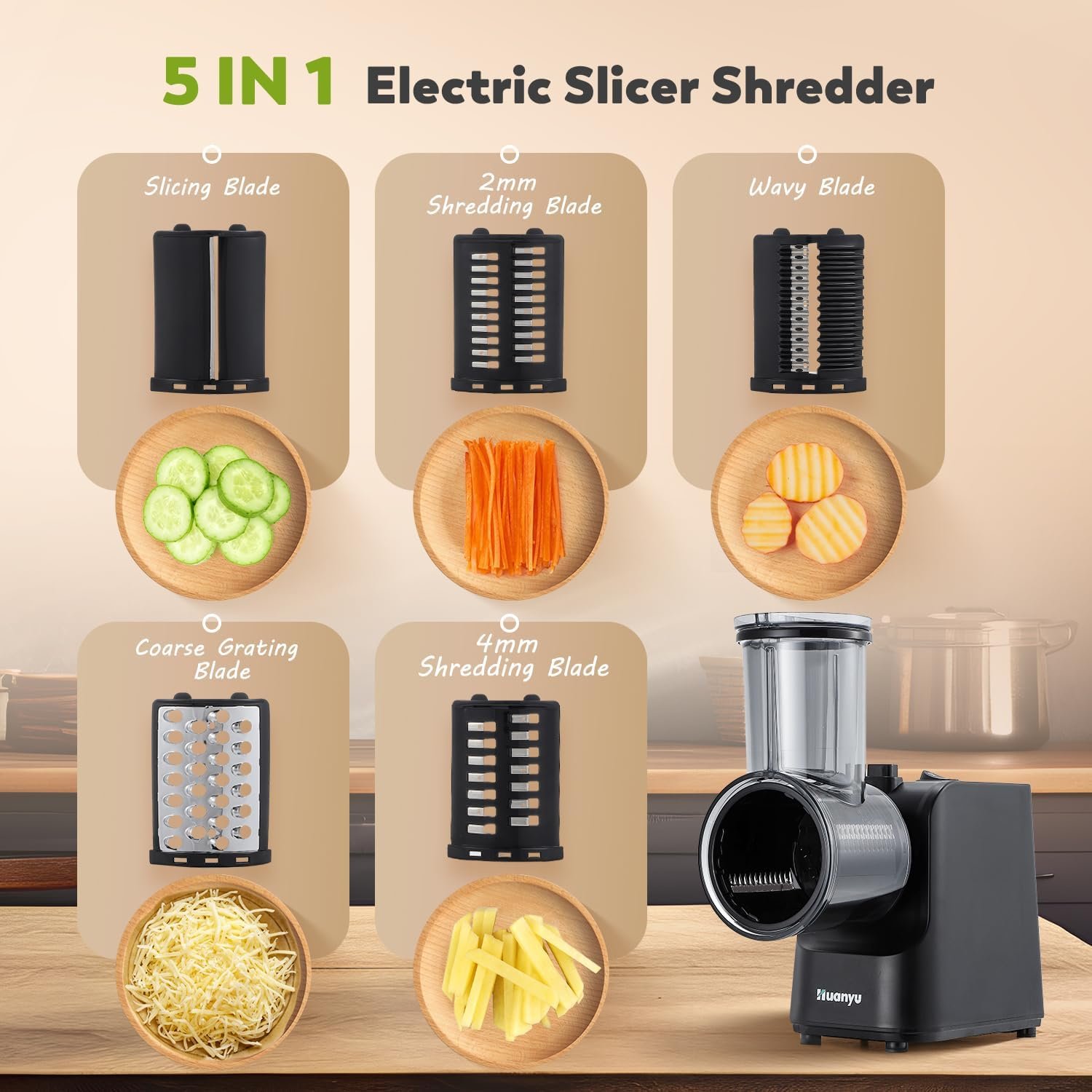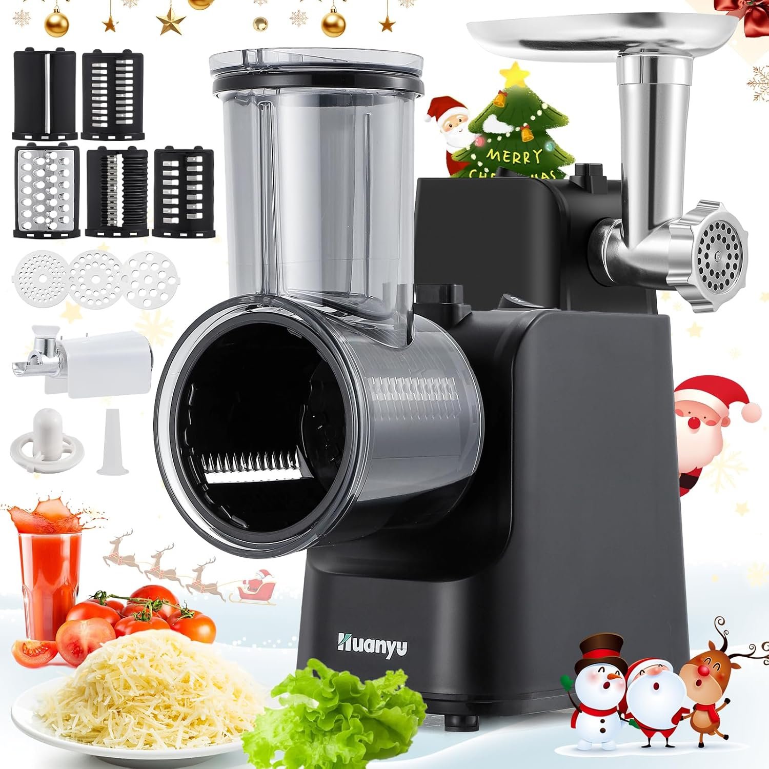 All-in-One: Huanyu electric cheese shredder is really a versatile kitchen tool that grates cheese, grinds meat, stuffs sausages, chops, and juices. The package includes 5 blade sets (slicer, wavy, coarse shredder, fine shredder, grater), 3 meat grinding plates, 1 sausage tube, 1 kibbe kit, and 1 tomato juicer attachment. Perfect for preparing a wide array of fresh and healthy meals with just one appliance