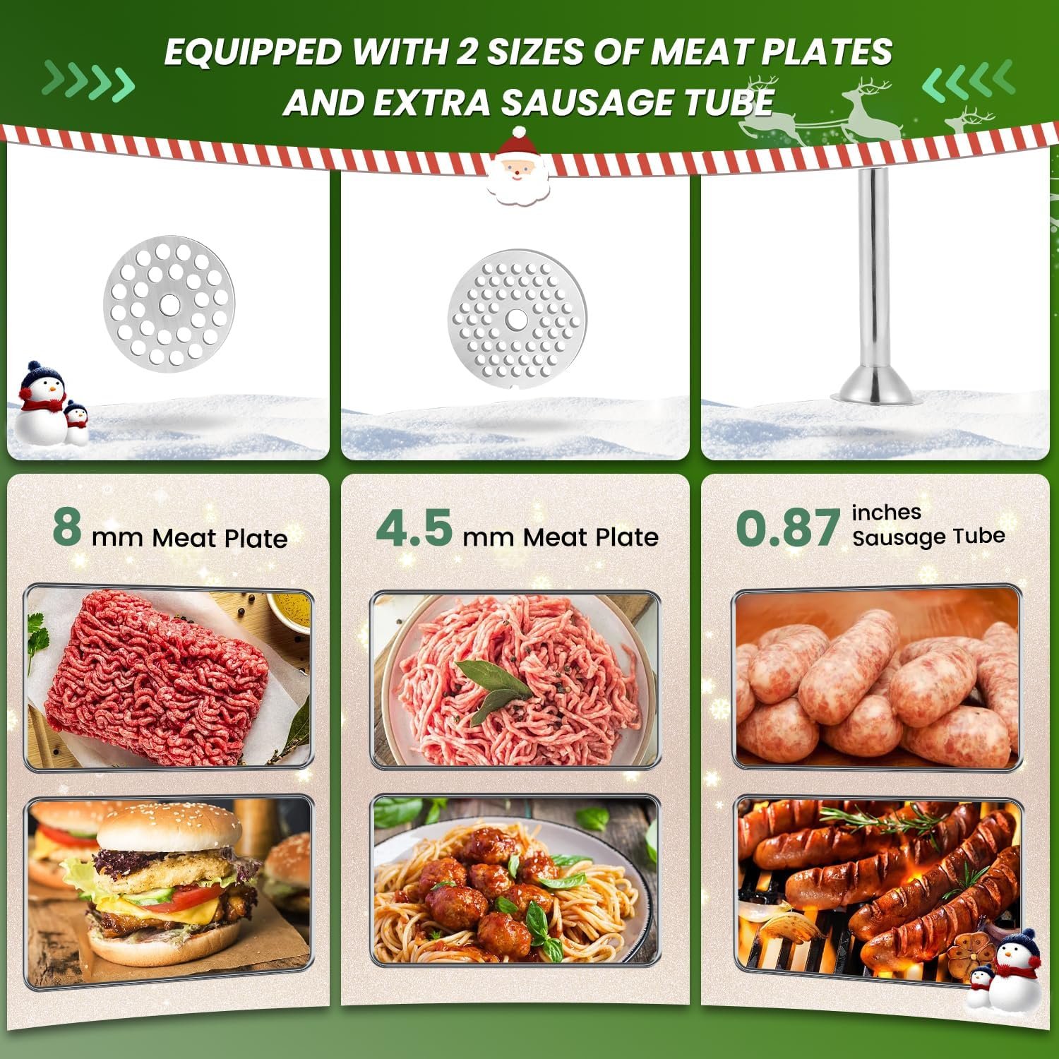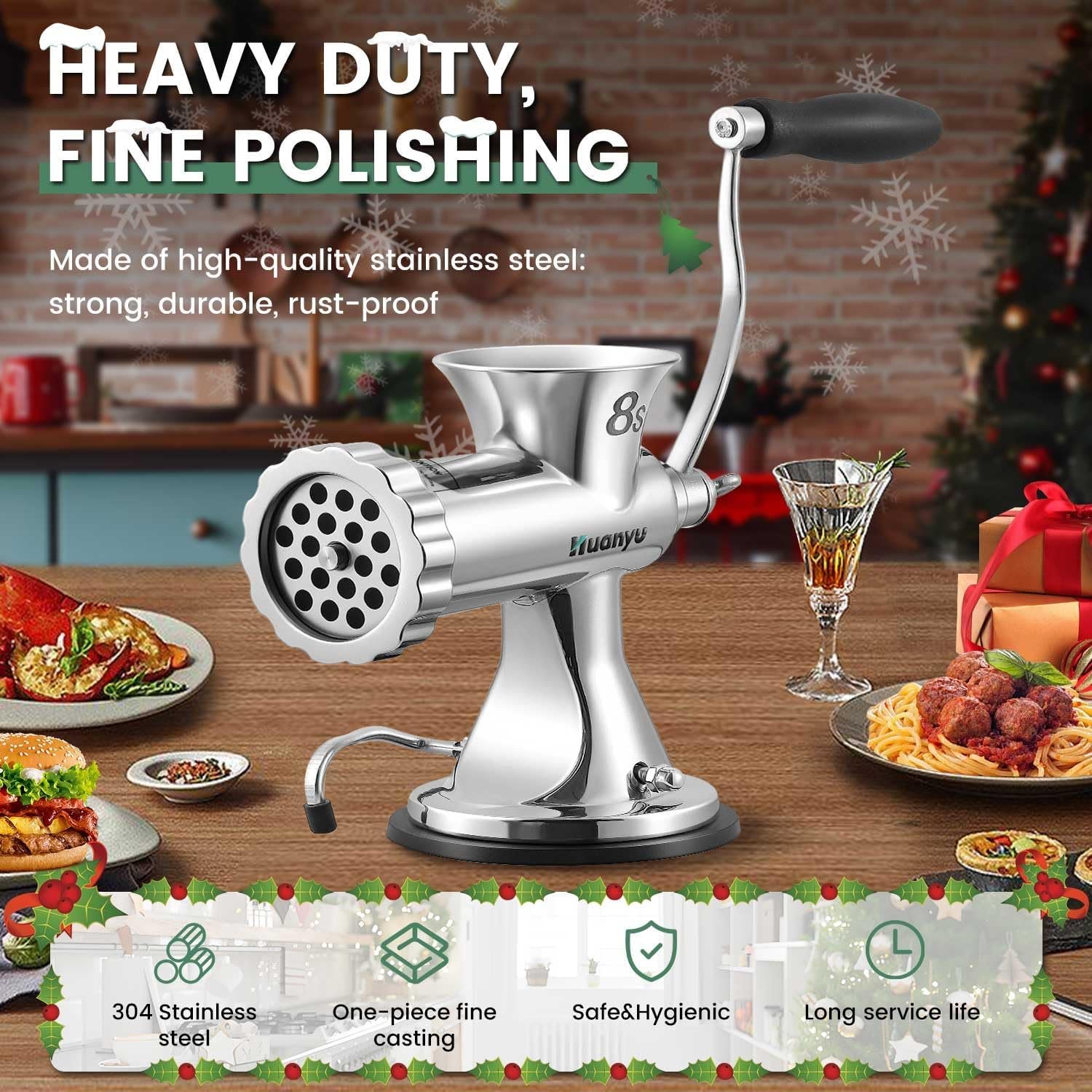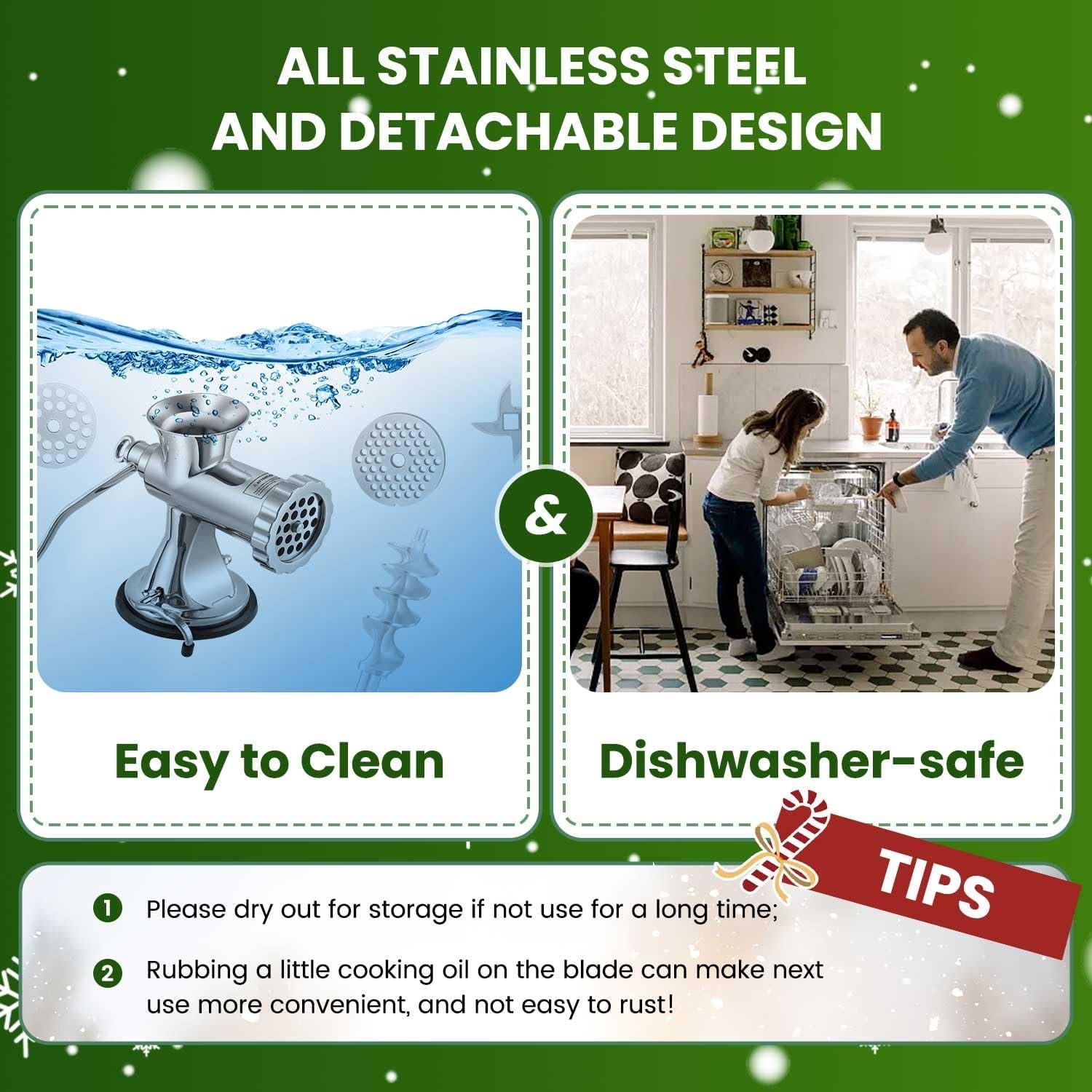 [Heavy duty stainless steel] This is a sturdy, durable meat grinder. The body and all metal parts are made of stainless steel in one piece casting. And it is dishwasher safe. There is no need to worry about oxidation, blackening or rust. The fine mirror polishing process makes the body and the internal parts are more perfect. You don’t have to worry about the problems of falling metal shavings and mixing into the food, cause the waste of expensive ingredients