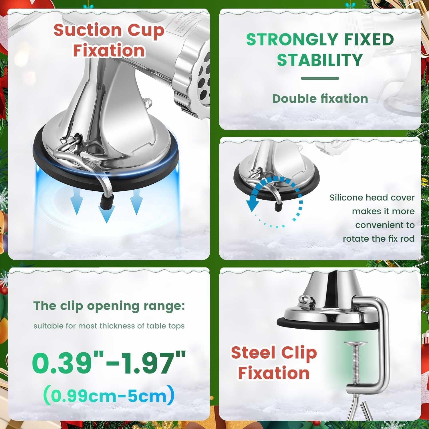 [Double fixation] The bottom strong suction cup and Stainless steel table clamp, double fixation to prevent the machine from moving during use, and don’t worry about it falling down, the operation is safer and more assured! The opening range of steel clip is 0.39″-1.97”, which is suitable for desktops with most thicknesses