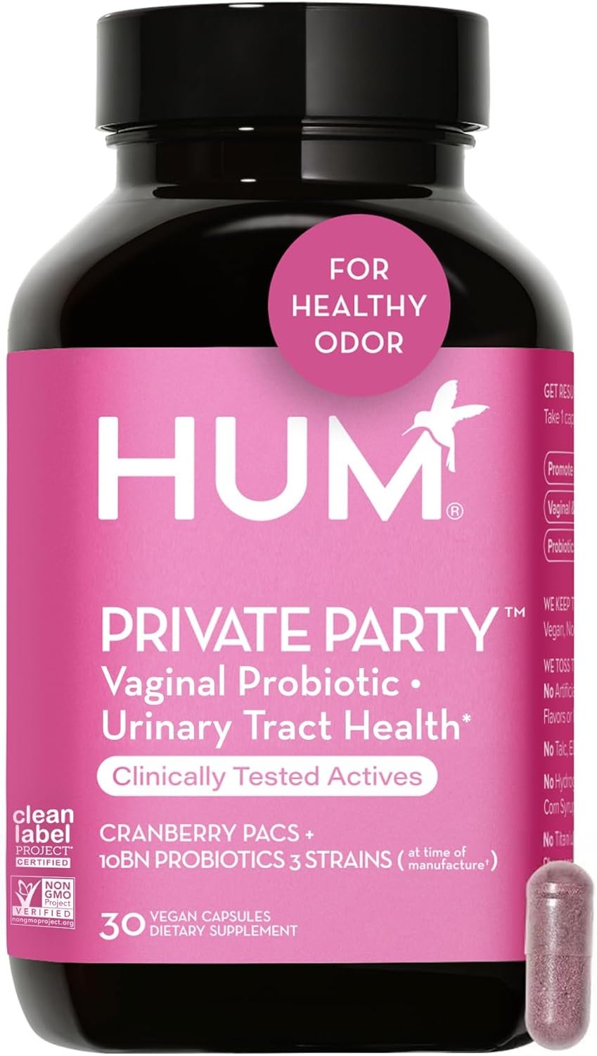 VIP VAGINAL HEALTH SUPPORT- Meet the potent probiotic and cranberry supplement from HUM Nutrition. Private Party helps to balance the vaginal microbiome and pH balance. It also promotes optimal urinary tract function.*