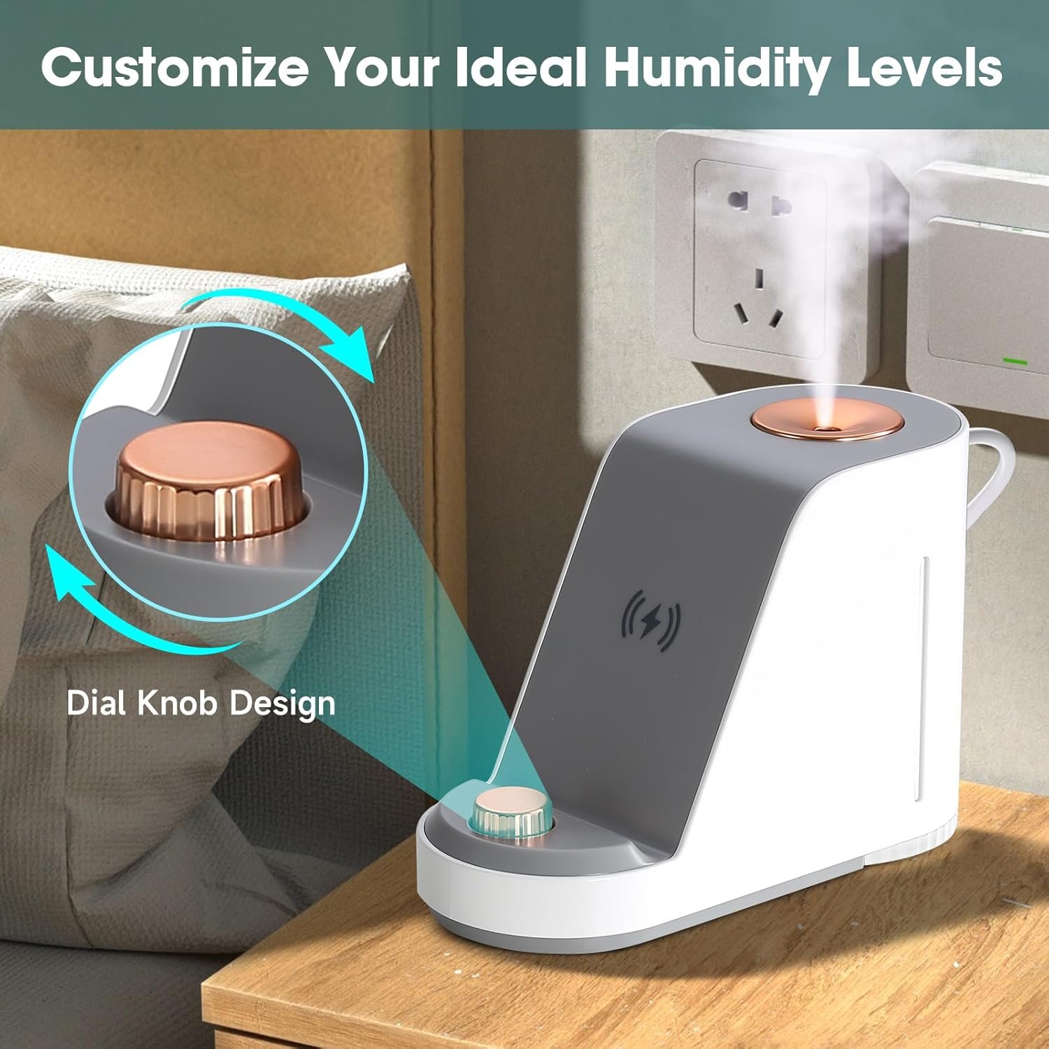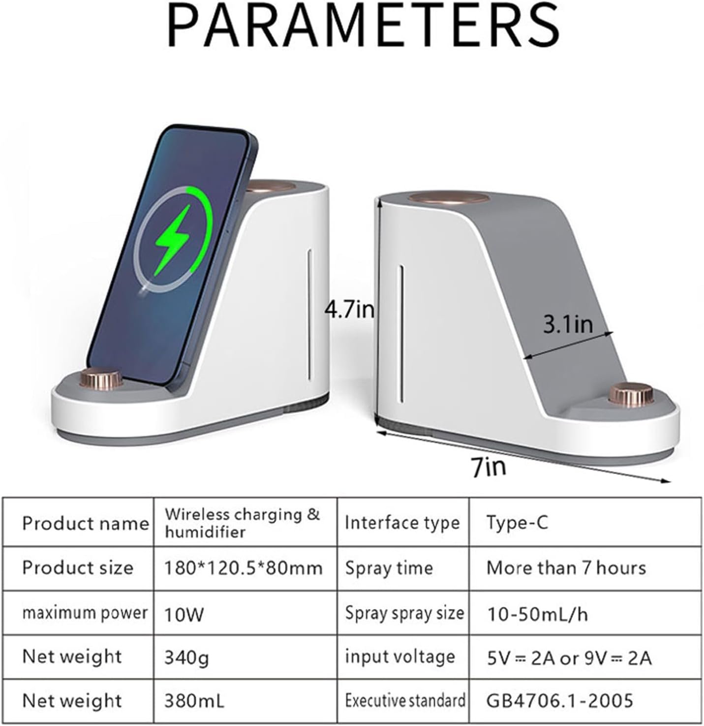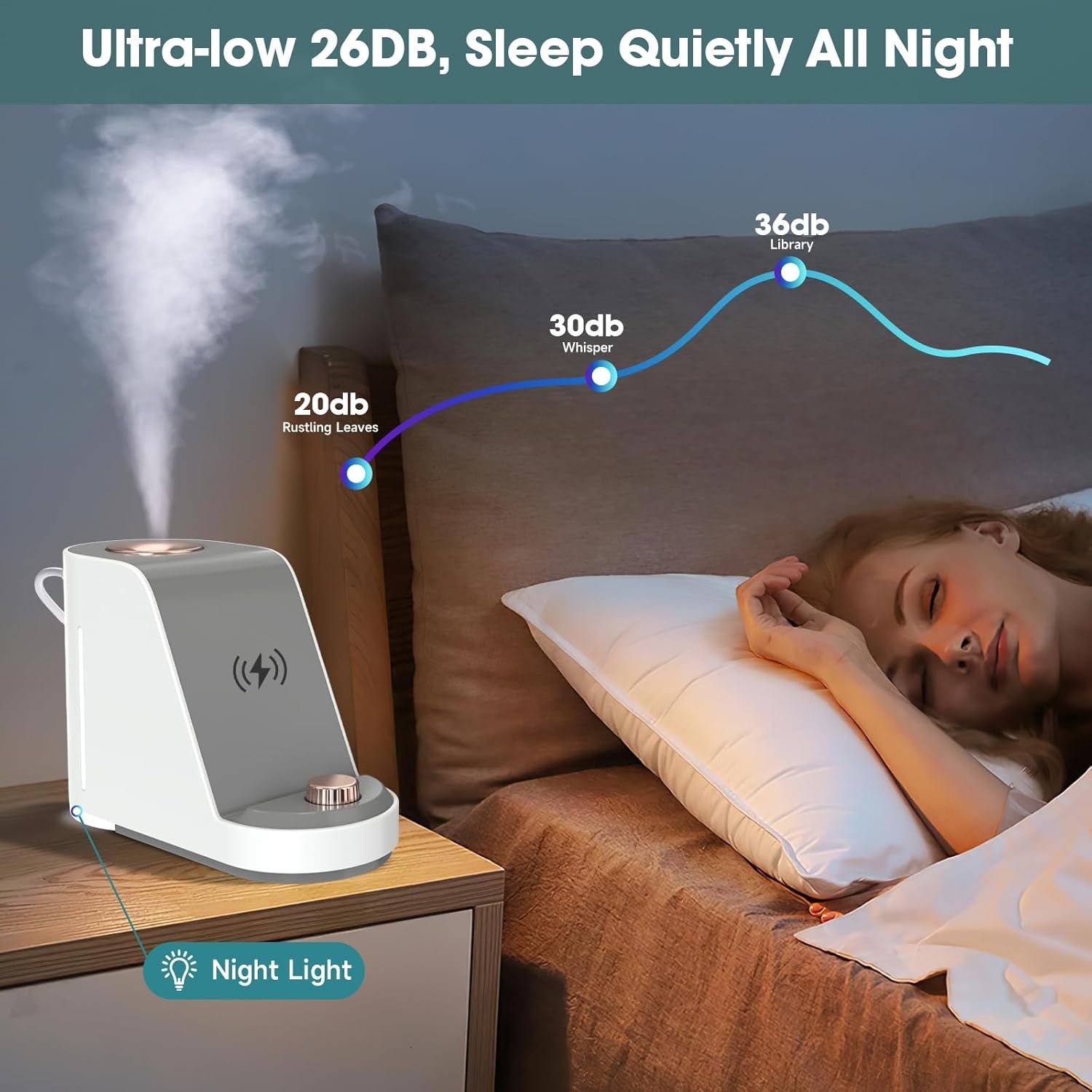 【4-in-1 Functionallity】 This humidifier combines ultrasonic humidification, wireless cell phone charging, night light, and cell phone holder, which can give you an all-around great experience.