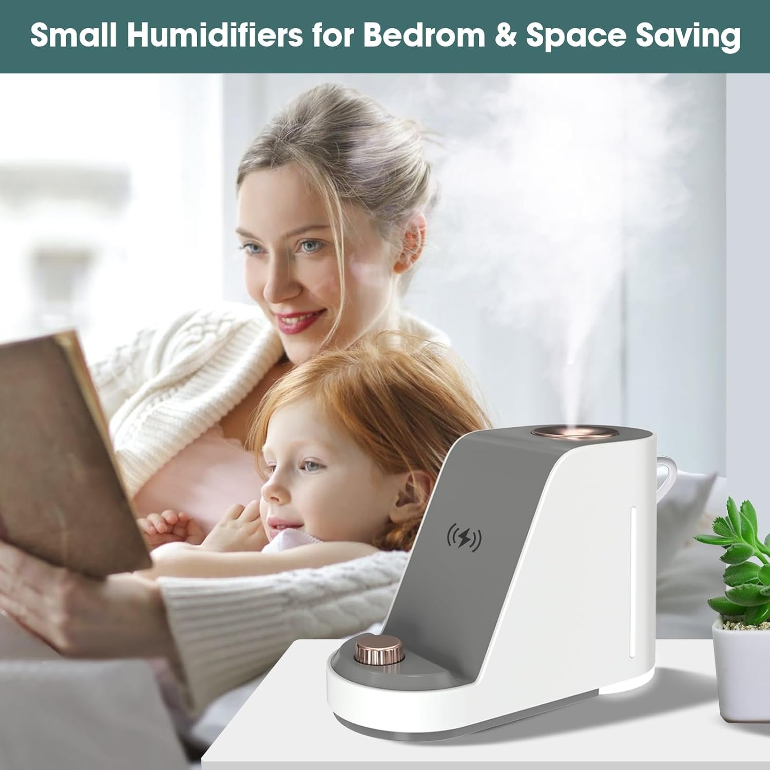 1. Best choice as Christmas, New Year, birthday, and Thanksgiving gifts for friends and family. 2. The little personal humidifier works in the sense of moistening the air and stopping sore throats, headaches, incredibly thirsty, dehydrated, stuffy noses, nosebleeds, and sinuses. 3. Baby humidifier with night light and visual water tank. The brightness changes with the size of the mist. It’s a reliable choice for parents with getting up a lot and having babies. 4. Desk humidifier office is small and doesn’t take up a lot of space, compact enough to sit on a nightstand. The size makes it convenient to travel with. 5. Bedroom humidifier provided enough moisture that you could breathe easy and sleep easier all night long. Easy to cope with dry air and static electricity. 6. Air humidifier easy to clean, directions are straight-forward. The functioning of the humidifier is also silent in low as well as high mode. 7. Mini humidifier with wireless charging. Support 15W fast charging for your cell phone. No need to worry about no charging cable or lack of socket. 8. Desktop humidifier can produces a consistent stream of mist. The mist is fine and doesn’t make your table wet. You can adjust the size of the mist output by turning the knob.