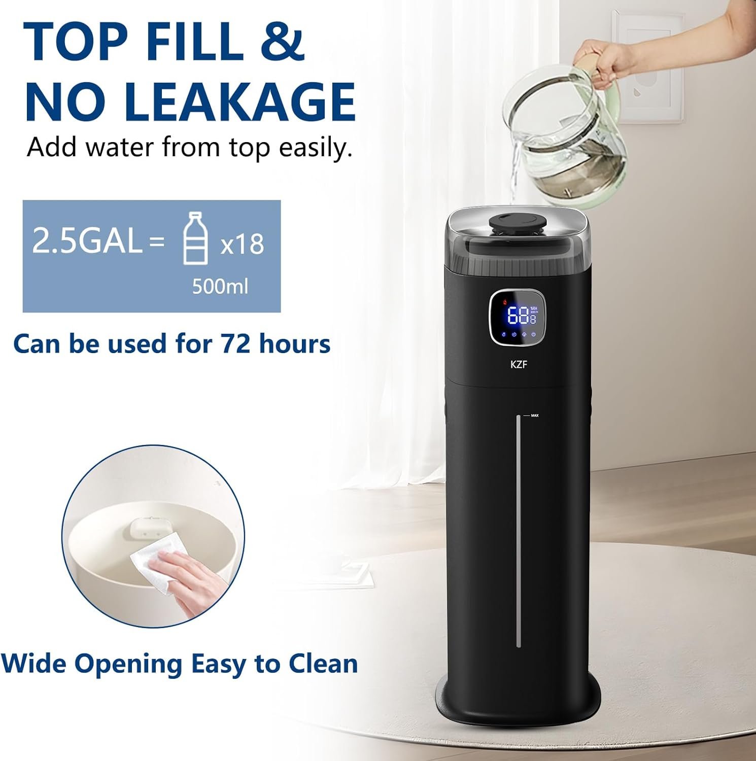 ๐—ง๐—ผ๐—ฝ ๐—™๐—ถ๐—น๐—น๐—ถ๐—ป๐—ด ๐——๐—ฒ๐˜€๐—ถ๐—ด๐—ป Makes cleaning and filling the humidifier quick and convenient. Top-fill design allows you to pour water and reduces the risk of spills. The 9L water tank is designed to last up to 72 hours of continuous use.You can directly move the machine under the faucet to fill the machine directly