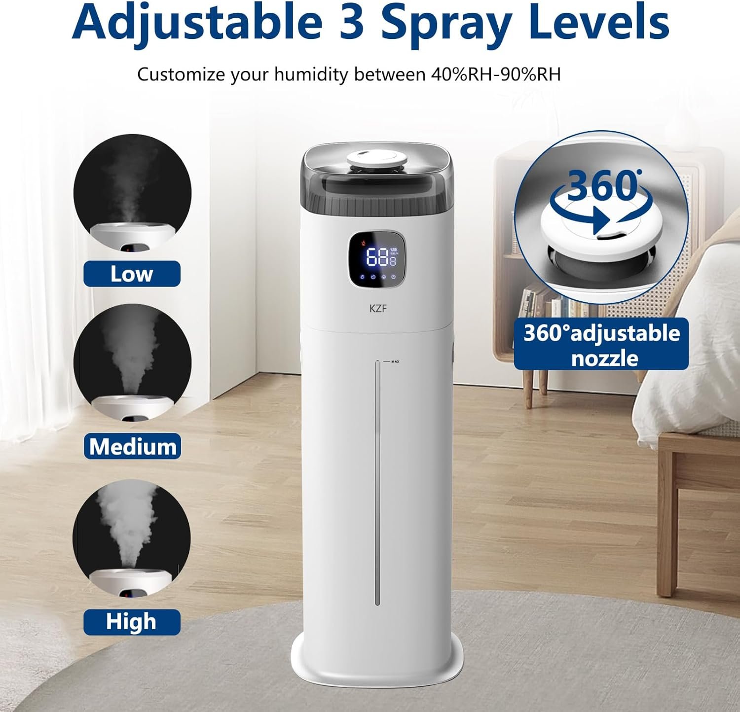 Large Room Humidifier 9 Liters 2.5 Gallons: 3-speed humidity adjustment (low/medium/high). Constant mist volume (≥72 hours, max 300ml/hour) and intermittent mist volume (1M 3M 5M). The built-in ultrasonic cool mist humidifier does not require any filter replacement, thus reducing ongoing maintenance costs.