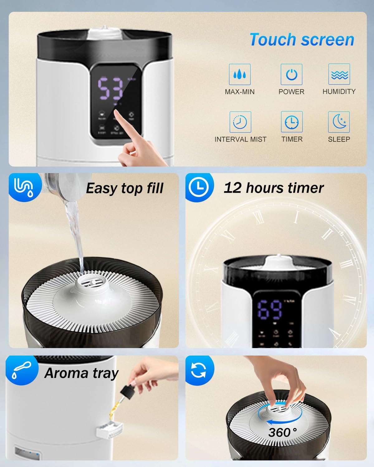 [Bedroom Humidifier with Diffuser & Night Light] Featuring a 12-hour timer and ultra-quiet operation, this humidifier is ideal for enhancing your sleep quality. The aroma diffuser tray and night light create a soothing atmosphere, helping to relieve stress and uplift your mood. This humidifier is conveniently operated with both a remote control and touch buttons.