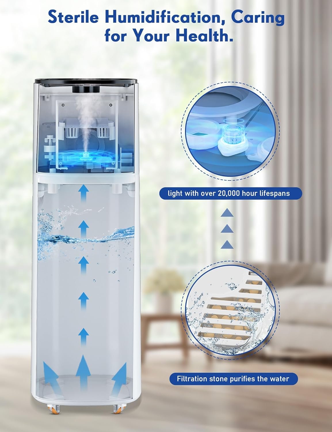 【Easy Water Refilling, Worry-Free Cleaning】 This unique top-fill design of the home humidifier allows you to easily add water from the top. Coupled with 4 flexible swivel wheels, moving it becomes effortless. Additionally, the spacious water tank opening makes it convenient for you to clean the tank easily, ensuring your humidifier stays clean at all times.