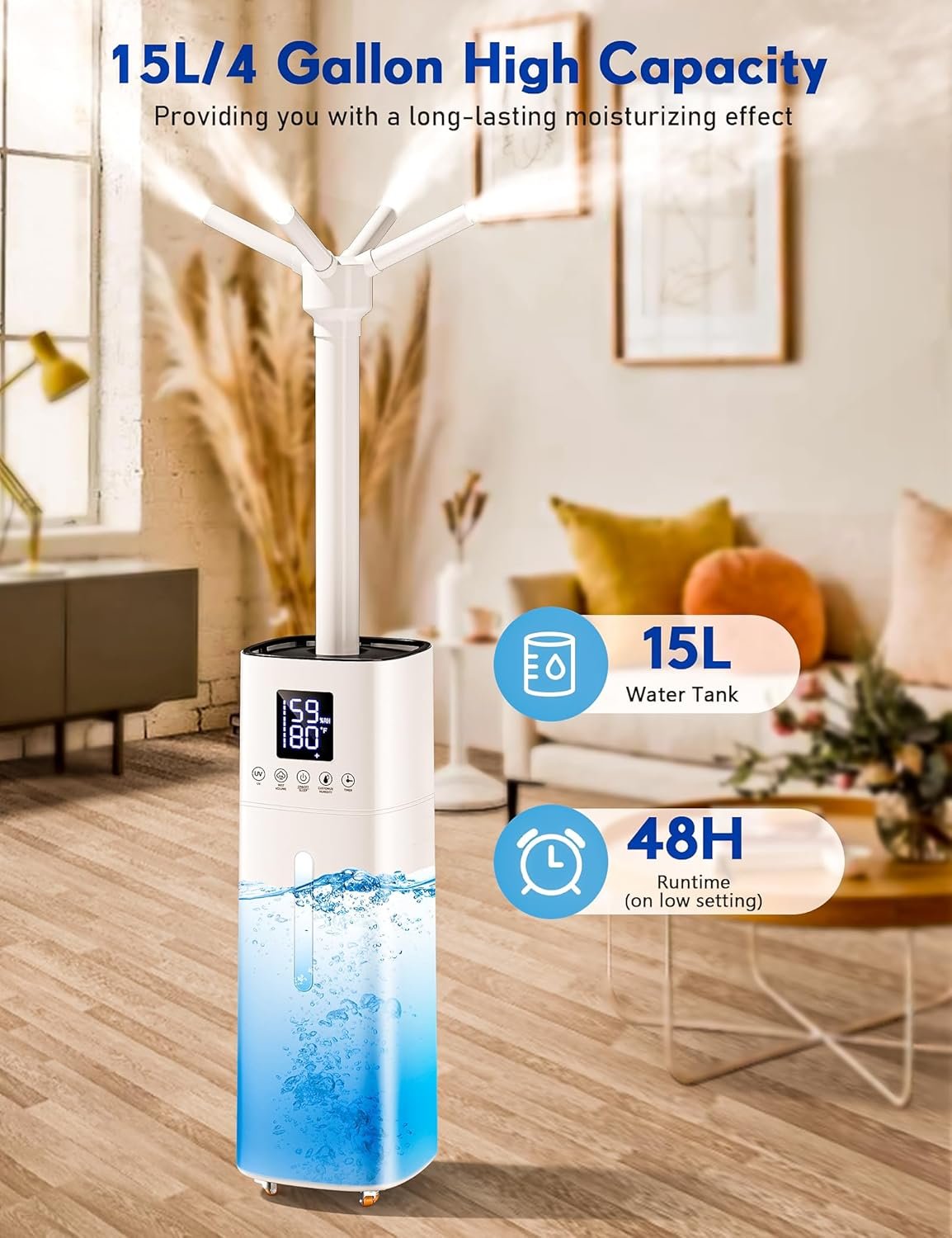 Humidifiers for Bedroom, 15L Wholehouse Humidifier for 2000 sq. ft, 600ml/h Cool Mist Humidifier for Large Room With Essential Oil Tray, Top Fill Floor Humidifier for Baby Yoga Plants