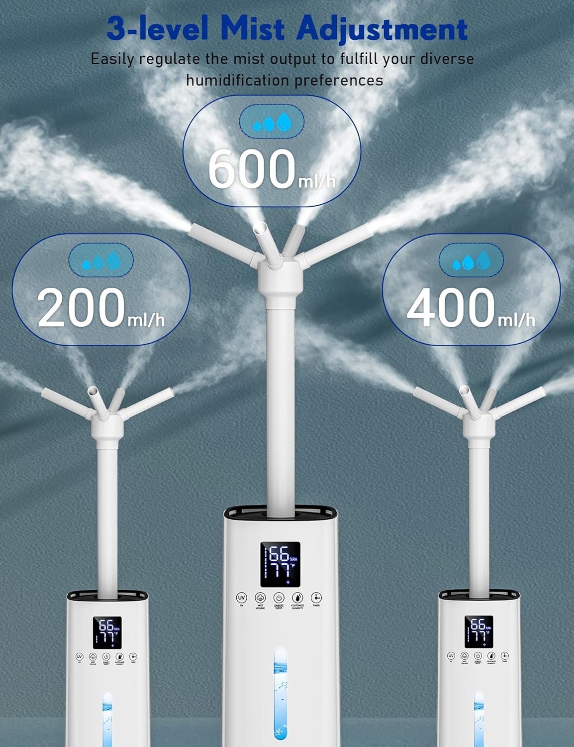 【Keep Your Air Perfectly Moisturized】Our large room humidifier not only automatically shuts off or starts based on your needs, but also offers three mist output options to meet different humidity requirements. You can customize the humidity range from 40% to 90%, ensuring your air stays comfortably moist at all times.