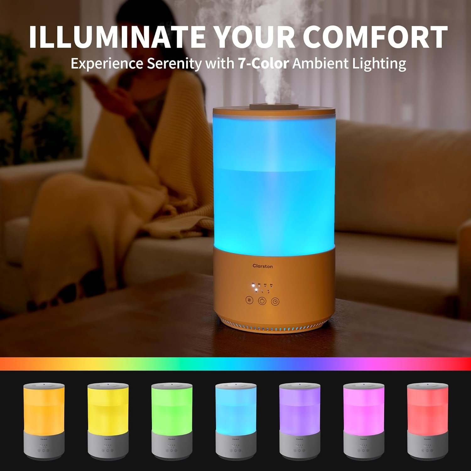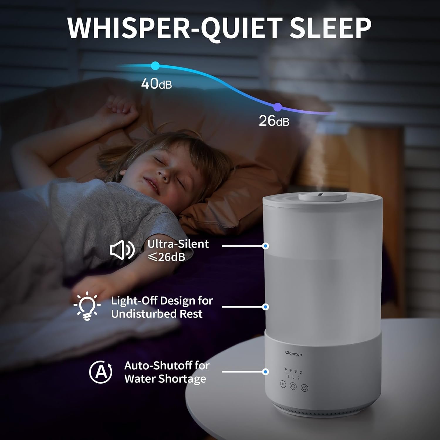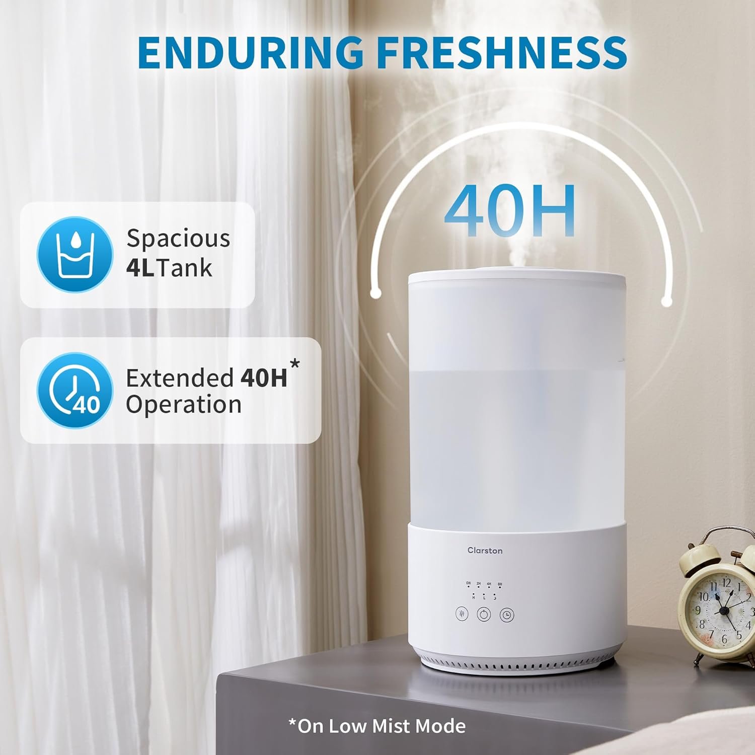 Extended Operation & Auto Shut-Off: With a 4L large tank, enjoy up to 40 hours of continuous humidification; the built-in timer allows up to 8 hours of set operation, promoting quicker sleep and effectively relieving congestion and dry throat.