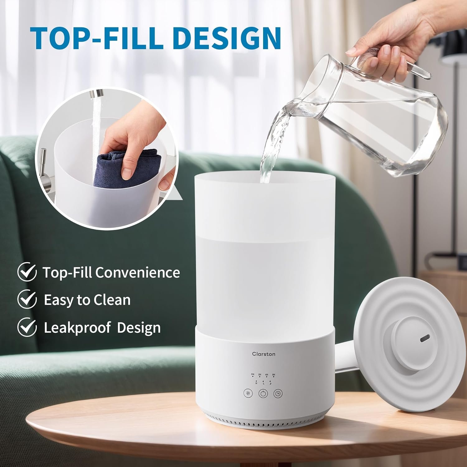 Top-Fill Design for Easy Refills: Forget the hassle of flipping your humidifier upside down; the top-fill design makes refilling the tank straightforward and spill-free, ensuring you can maintain optimal humidity levels with ease.