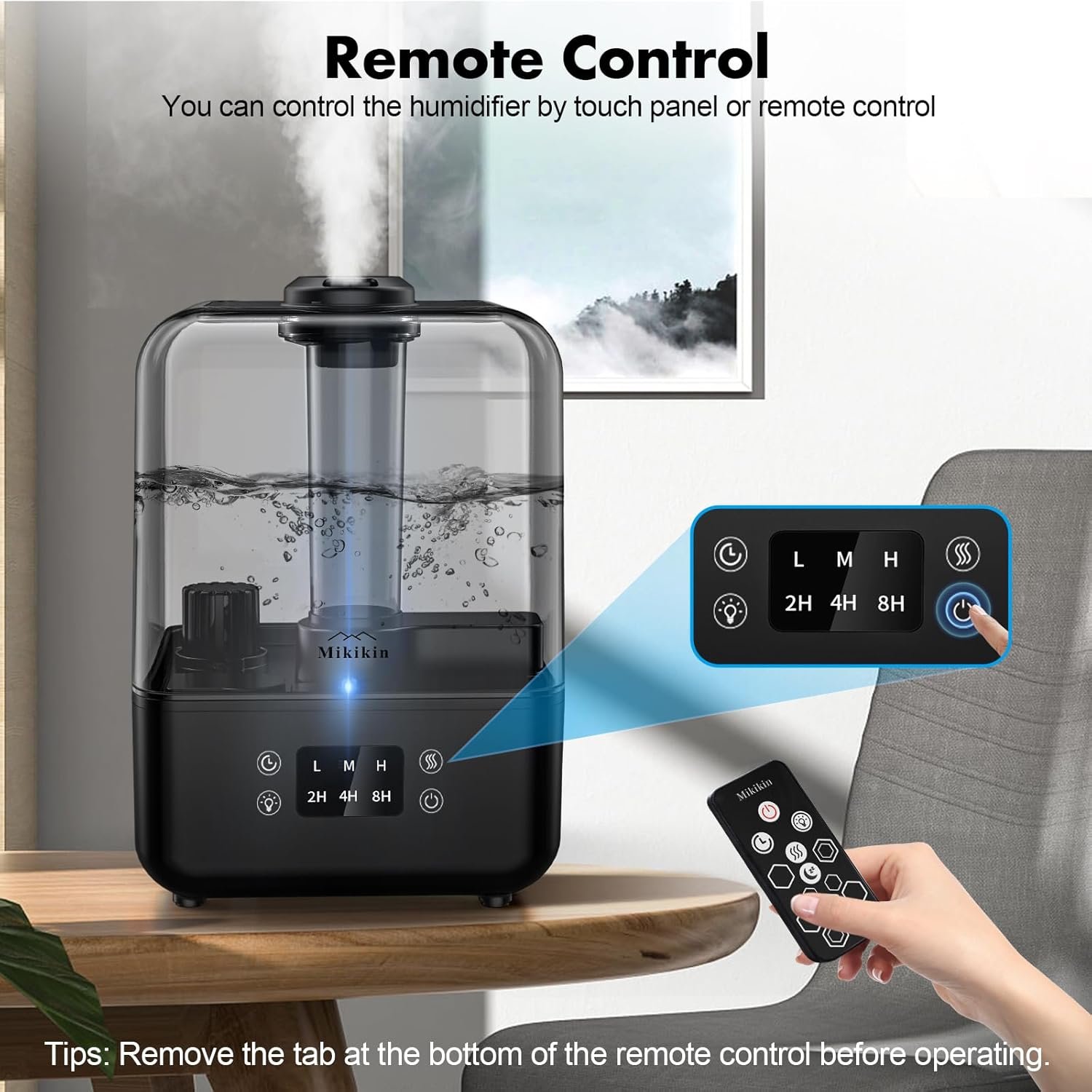 【Ultrasonic Cool Mist Humidifier】Mikikin whole house humidifiers safely and quietly moisturize the dry air in your room to help you effectively get relief and bring you better breathing and comfortable life. The rotating nozzle can adjust the direction freely and direct mist anywhere you like, providing an even level of humidity. Note: Please remove the white foam from the base before use.