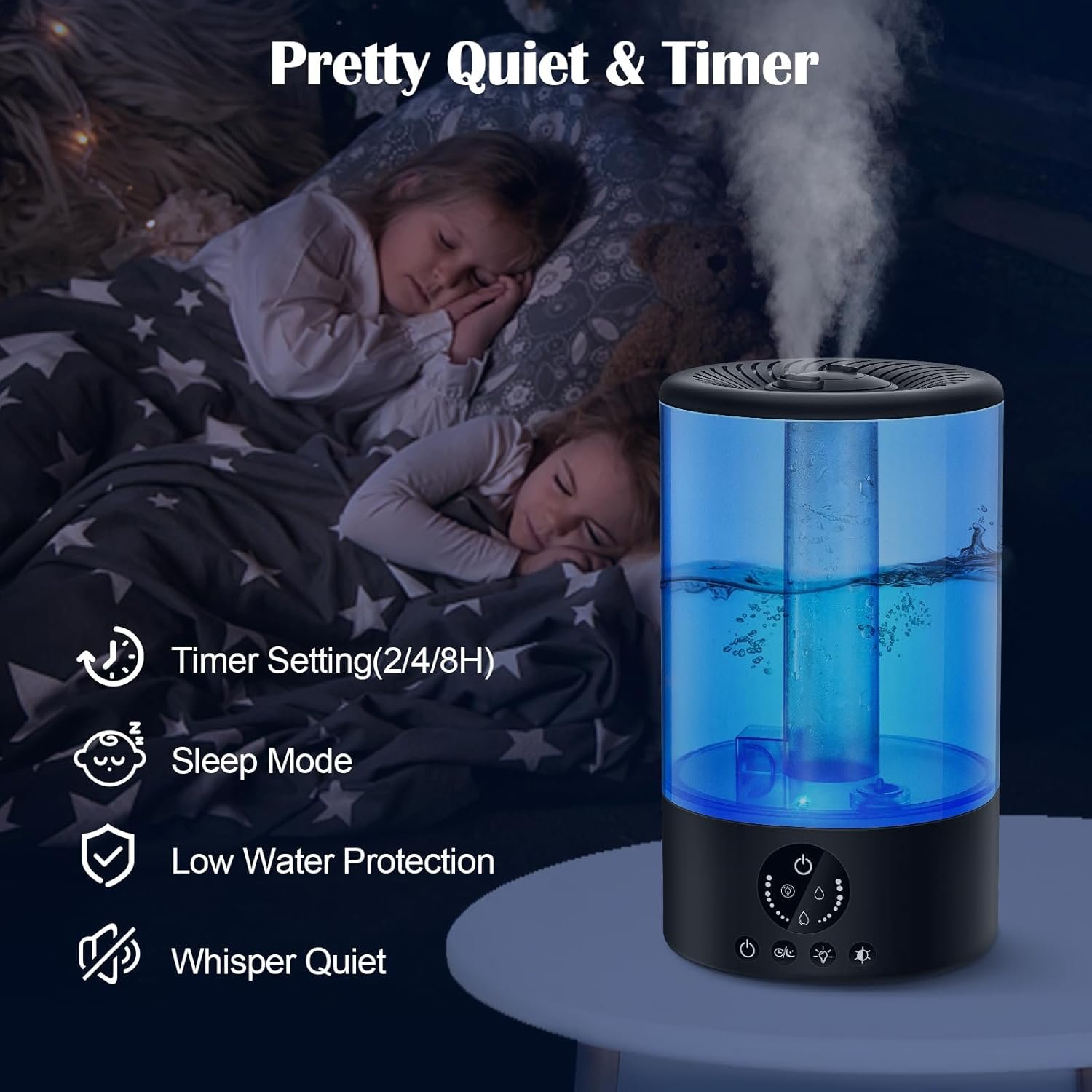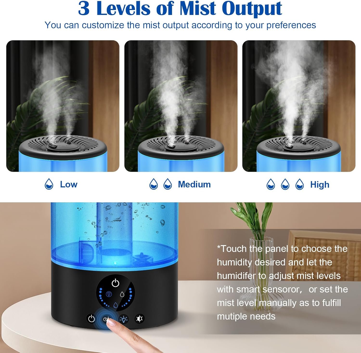 Sleep in total silence! No need to tolerate hums and whistles. The humidifier operates quietly and steadily to create a soothing and peaceful sleeping atmosphere for you!Powerful mist output with high and low settings makes this humidifier ideal for bedrooms, baby nurseries, office, home,and indoor plants.