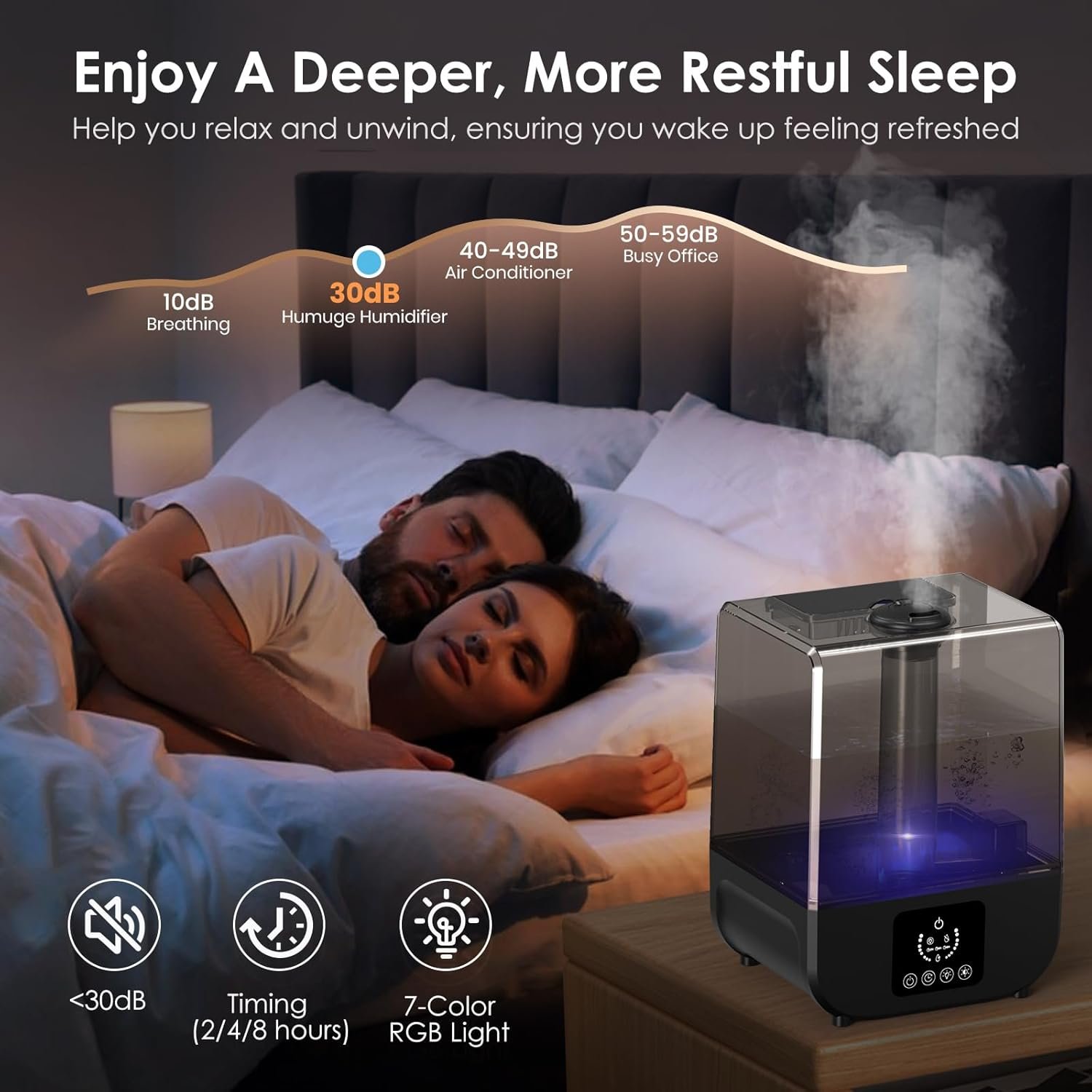 【BEST HUMIDIFIER FOR BEDROOM】This small humidifiers has a remote control function。Lying in bed, using the Remote Control to settings timing, 3 adjustable spray levels, led night light, sleep mode, etc. Humanized design, convenient using experience(Remote control distance of 1-2M). The mini humidifier will raise RH by 12% in 30mins. Enjoy the soft night lights, and the Sleep Mode will give you an optimal sleep-humidifying environment..