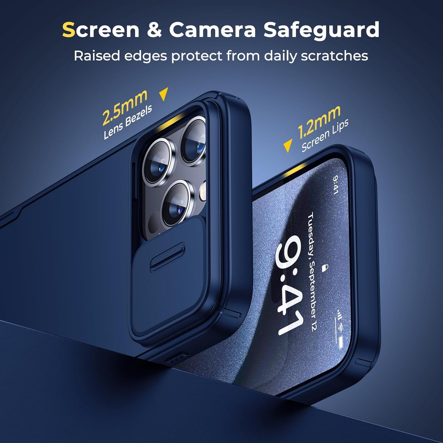 [Certified 14FT Mil-Grade Shockproof] Equipped with an upgraded multiple cushion structure, This iPhone 15 Pro Max phone case contains exterior 4-corner U-shock absorbing airbags, a reinforced soft TPU bumper, and an impact reducing backplane, can disperses 99% impact force. The iPhone 15 Pro Max Case with camera cover has survived 12000+ 14FT tests to achieve military grade drop standard (MIL-STD-810G 516.6), guaranteeing lasting safety and full body protection to your phone.