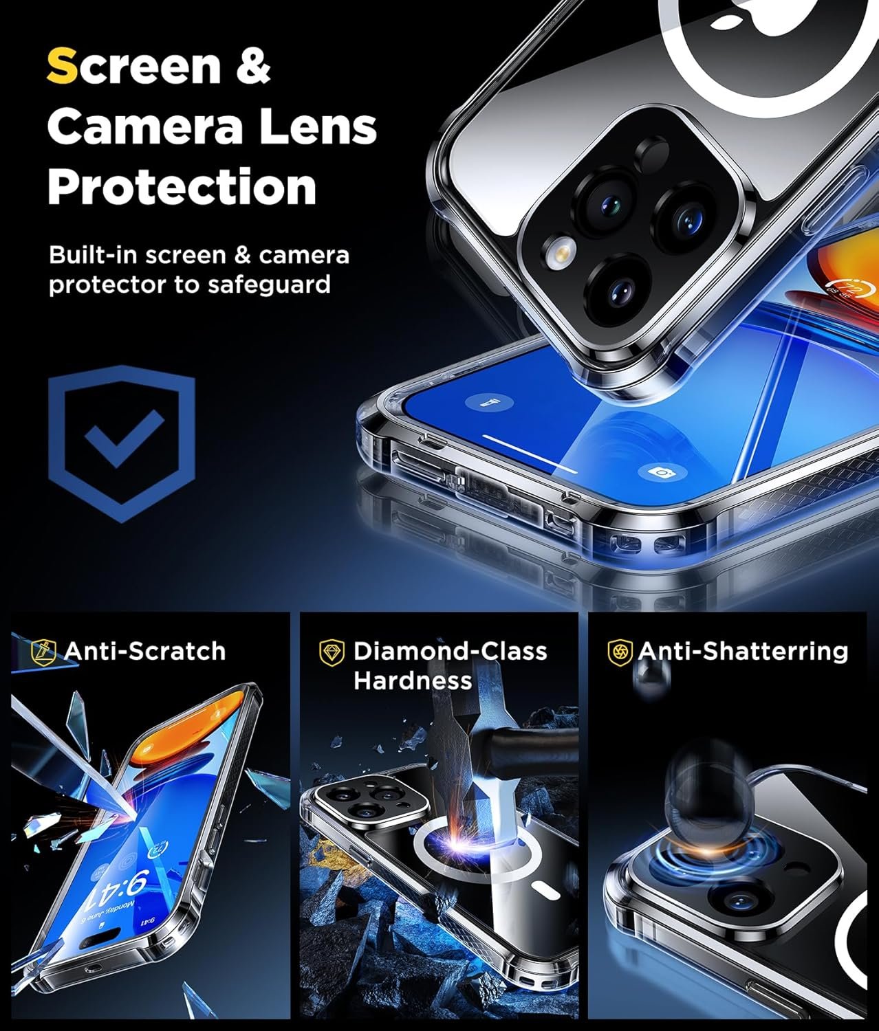 【Ultra Clear Like Crystal】 Made of DE Bayer materials, this clear case offers 100% light transmittance, showcasing the 15 Pro Max’s original color. It surpasses others in clarity, thanks to micro-dot laser craftsmanship and Blu-ray molecular injection.