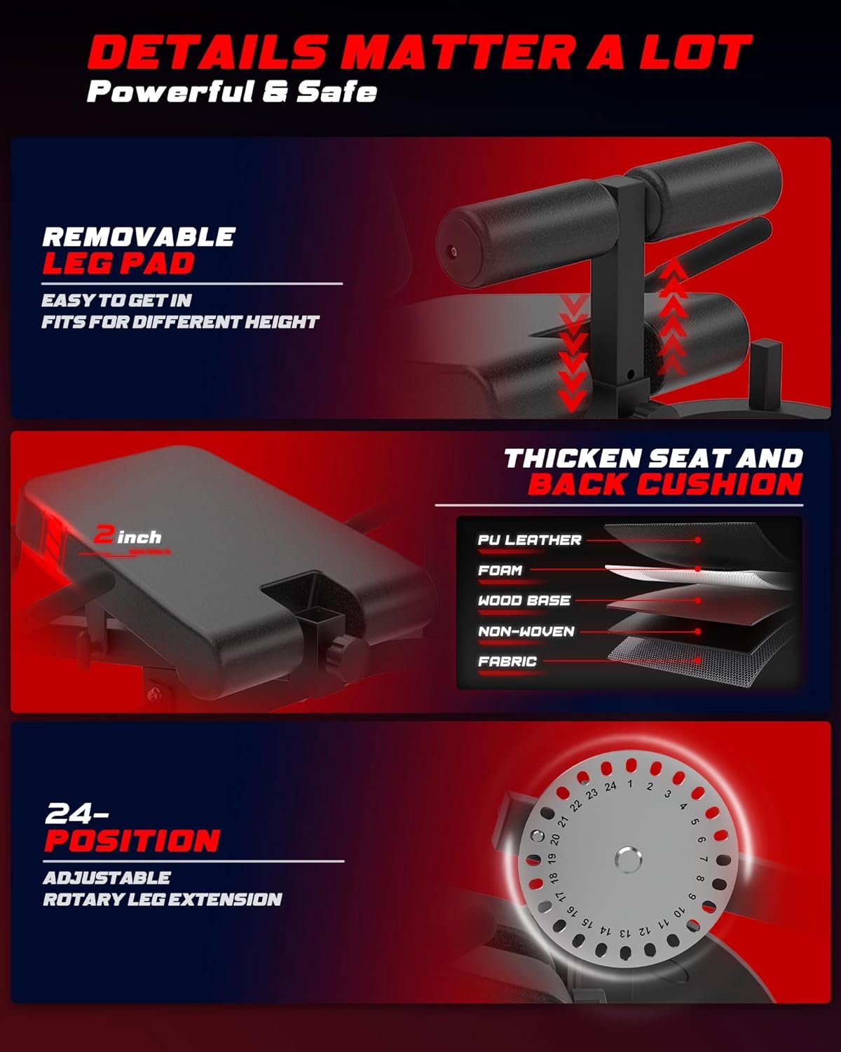 HVO 3+3+6+7 FLEXIBLE POSITION : The machine a the perfect companion for your workouts. With 3 BACKREST POSITIONS VERTICAL TO FLAT, 3 SEAT POSITIONS, THIGH FOAM ROLLER ADJUSTED IN 6 HEIGHTS,7 BACKREST POSITIONS. This leg extension and curl machine lets you exercise freely and comfortably, ensuring a more effective fitness routine.