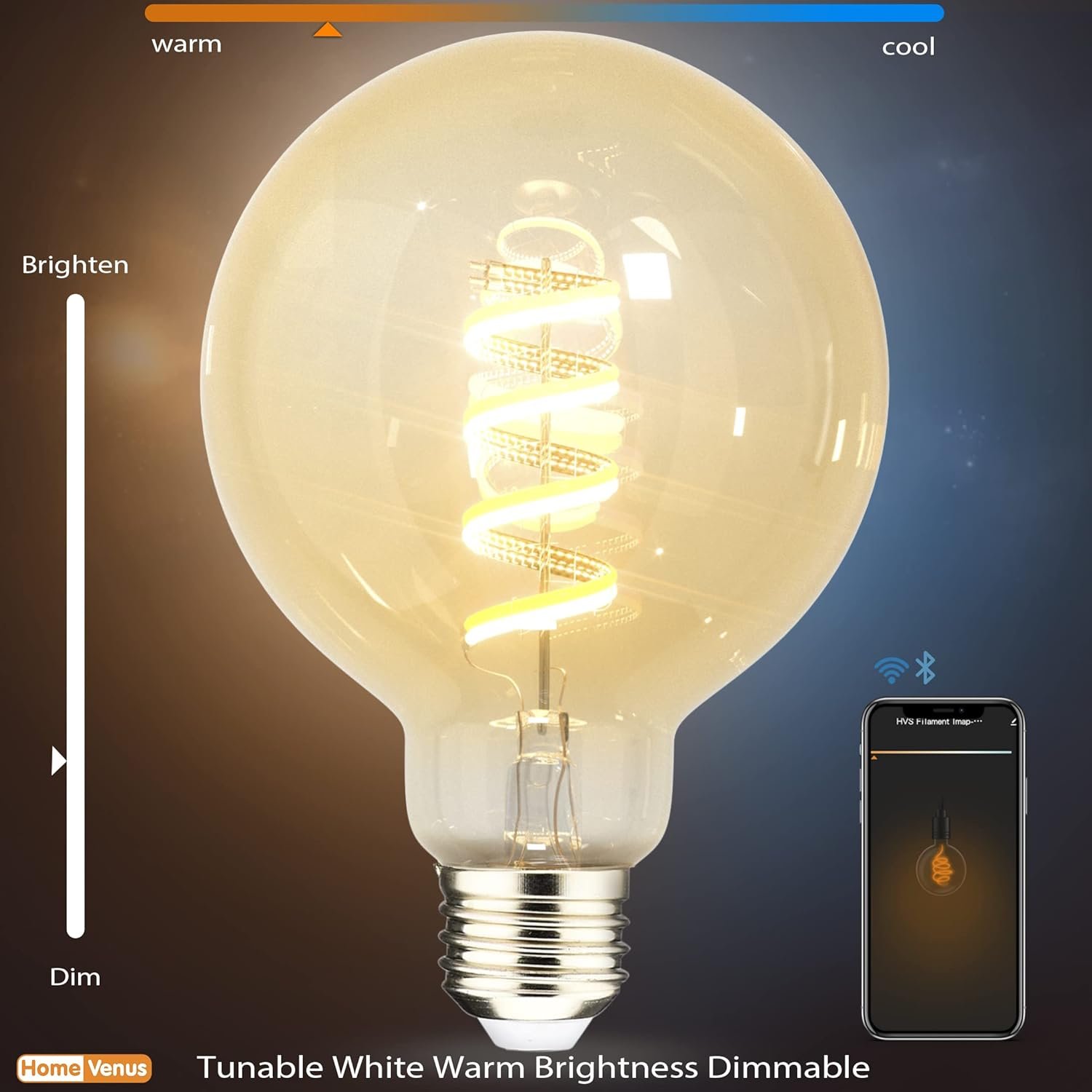 [ Dimmable and Tunable White Function ] HVS smart led light bulbs support both tunable cool to warm white and dimmable. You can control the color temperature (from 2100k to 5000k) and brightness (from 1% to 100%) anytime and any where. The smart filament bulbs suits the change of light and life scenes full day long. The warm mood lighting suits leisure time, and white functional lighting suits work time. Biological rhythm simulate the light change of the day and let you feel the natural light.
