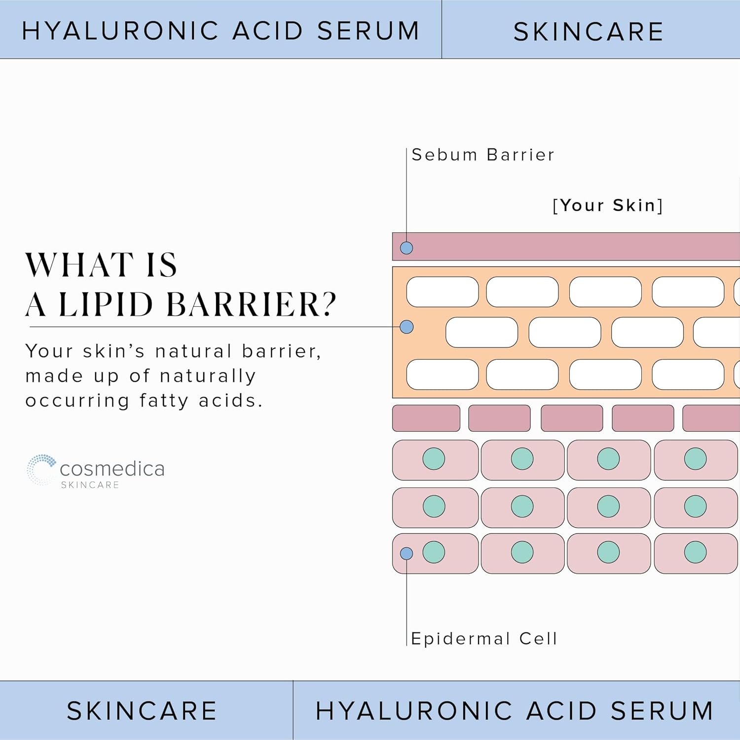 Guaranteed to outperform your traditional antiaging facial moisturizer or cream. Typical over the counter serums and facial care products provide temporary relief of dry skin and also come with a long list of unnatural ingredients. Our Cosmedica Hyaluronic Acid Serum works to hydrate and plump the deep layers of your skin and also contains only 3 all natural ingredients!