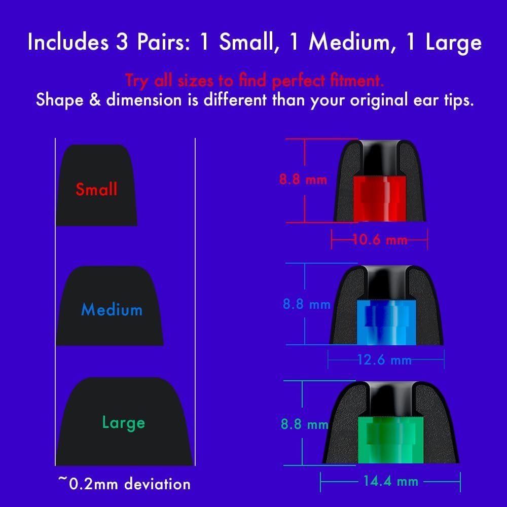 [Does Not Fall Out] Great Seal and great to wear for many hours. Includes 3 sizes: Small, Medium, Large to fit all ear shapes and sizes. [Fit perfectly in charging case] Does not include wireless earbuds.